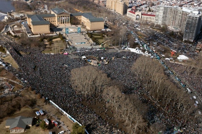 La gran celebración de los aficionados de los Eagles de Filadelfia por su triunfo en el Super Bowl LII llegó hoy a las calles del centro de la ciudad, que fue tomada por cientos de miles de personas para vitorear a sus nuevos ídolos deportivos.El gran sueño de los aficionados se vio cumplido cuando el domingo los Eagles derrotaron de manera sorpresiva por 41-33 a los Patriots de Nueva Inglaterra en el partido del Super Bowl que se disputó en el U.S. Bank Stadium de Minneapolis y pusieron fin a una espera de 58 años.La celebración después de tanta espera mereció la pena para que desde altas horas de la madrugada algunos acamparan en automóviles y edificios de oficinas e incluso en tiendas de campaña para asegurarse que podrían ser testigos de la celebración de los nuevos campeones del Super Bowl.Tampoco las bajas temperaturas y los vientos gélidos fueron impedimento para que los aficionados se asegurasen un puesto en el recorrido de más de 7,5 kilómetros que hicieron todos los componentes del equipo de los Eagles con su dueño Jeffrey Lurie a la cabeza, que comenzó cerca del estadio del equipo, el Lincoln Financial Field, y concluyó en las escaleras del Museo de Arte.Las mismas que corrió el actor Sylvester Stallone, que representó el papel del boxeador Rocky Balboa, en la histórica saga de películas de 'Rocky'.Junto a Lurie, en el mismo autobús que encabezó el desfile, también se encontraban los mariscales de campo Nick Foles, Carson Wentz y Nate Sudfeld.Lurie sujetaba un letrero en el que se podía leer "Thank You Fans" (Gracias Aficionados), mientras que Foles, ganador del premio de Jugador Más Valioso (MVP) frotaba el trofeo Vince Lombardi de campeones del Super Bowl LII.Los aficionados presentes en el desfile también pudieron disfrutar de un momento especial cuando el entrenador en jefe de los Eagles, Doug Pederson, que hizo su debut en el Super Bowl y superó al legendario Bill Belichick, de los Patriots, decidió bajarse del autobús para generar otra sorpresa.Esta vez no fue en el campo con sus movimientos tácticos sino que sujetó el trofeo Vince Lombardi y se fue con él hacia los aficionados para que pudiesen tocarlo y tenerlo cerca, lo que generó un auténtico delirio.Algunos jugadores de los Eagles lanzaron camisetas a los aficionados a lo largo del desfile, mientras que otros como el centro titular Jason Kelce, quien iba disfrazado, siguió el ejemplo de Pederson y caminó durante el trayecto para saludar de mano a algunos aficionados.Los organizadores confirmaron que esperaban a más de dos millones de personas, las que salieron a las calles de Filadelfia para participar en la celebración del desfile.Escuelas, museos, tribunales, oficinas de gobierno e incluso el zoológico de Filadelfia fueron cerrados para que la ciudad pudiese celebrar el gran triunfo sorpresa que consiguió el equipo.Algo así no se daba en la ciudad desde el 2008 cuando los Filis de Filadelfia, equipo de béisbol de la Liga Nacional, ganó la Serie Mundial y también hubo cerca de un millón de personas que celebraron el triunfo.Mientras que el sentir general de los aficionados hace una semana era que no estaban convencidos de que en sus vidas tendrían la oportunidad de ver ganar un Super Bowl a los Eagles, ahora su preocupación es si habrá una segunda.Por eso nadie quiso perderse la primera, que ya es histórica.LS