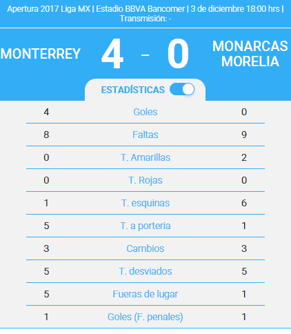 Monterrey avanzó a la final del Apertura 2017 derrotando como local al Morelia por 4-0 (global 5-0).Monterrey enfrentará a la final a Tigres, que derrotó ayer por 3-0 (4-0 global) al América. Será la primera ocasión en la historia en que el campeón se decida con un Clásico regiomontano.Rogelio Funes Mori anotó tres tantos para Monterrey (9', 28' y 52') y Carlos Sánchez completó la cuenta con un penalti (21')El partido de Morelia duró 17 minutos. En ese lapso los michoacanos tuvieron dos ocasiones de gol y erraron un penalti (cobrado por Ruidíaz) que los hubiera puesto en la contienda por el boleto a la final.Monterrey tiró un cubetazo de agua fría al entusiasmo de Morelia con un gol de Funes Mori tras un despeje del portero regiomontano Hugo González que llegó hasta el área de los visitantes al minuto nueve.Al 19' Carlos Sánchez no falló desde los 11 pasos e hizo válido un penalti cometido sobre Funes Mori.Como si no bastara la desventaja que en ese momento era de 3-0 en el global, Morelia empeoró su situación con un error del portero Sosa, que al intentar interceptar un tiro libre de Monterrey le puso en bandeja de plata a Funes Mori su segundo gol de la tarde.El tercer tanto para el argentino llegaría al 52', con un centro por izquierda que el mellizo remató de cabeza para sellar el 5-0 en el marcador global.El resto del segundo tiempo fue un trámite en el que Monterrey pensaba ya en la final, mientras Morelia, desmadejado anímicamente, fue incapaz de organizar llegadas de peligro.La final se disputará la próxima semana. La ida se jugará el próximo jueves en el estadio de Tigres y la vuelta el domingo en casa de Monterrey.MONTERREY: González, Basanta, Cardozo, Pabón (Bueno, 75'), Sánchez, González, Medina, Funes Mori (González, 60'), Benítez, Sánchez (Molina, 56'), Vangioni, D.T. MohamedMORELIA: Sosa, Rodríguez (Rocha, 87'), Osuna, Sepúlveda, Guzmán, Millar,Valdés, Vegas, Achilier, Lezcano (Vilchis, 54'), , Ruidiaz (Sansores, 55') D.T.HernándezÁRBITRO: Jorge Isaac Rojas Castillo