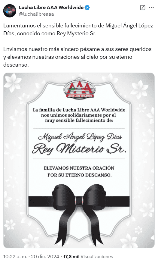 Este viernes 20 de diciembre, la lucha libre mexicana se vistió de luto después de que se informara de la muerte de Miguel Ángel López Días, conocido como "Rey Misterio Sr".La noticia fue dada a conocer por la AAA, que publicó el mensaje en sus redes sociales: "Lamentamos el sensible fallecimiento de Miguel Ángel López Días, conocido como Rey Mysterio Sr. Enviamos nuestro más sincero pésame a sus seres queridos y elevamos nuestras oraciones al cielo por su eterno descanso".Rey Misterio Sr. nació en Tijuana, Baja California, en 1958. Fue luchador profesional, entrenador y actor, además de una de las más grandes estrellas de esta disciplina, y uno de los promotores de la AAA en las décadas de los 80 y 90. Era tío de Rey Misterio Jr., luchador estrella de la WWE en Estados Unidos.Hasta el momento, ni su familia ni personas cercanas al exluchador mexicano han dado detalles sobre las causas de su muerte.*Mantente al día con las noticias, únete a nuestro canal de WhatsAppOF