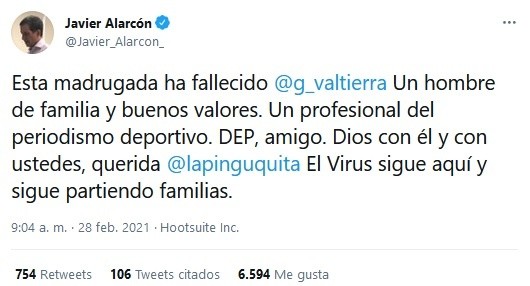 Luego de una batalla contra el COVID-19, la madrugada de este domingo 28 de febrero falleció el periodista deportivo Gerardo Valtierra.El exconductor de Televisa se contagió del coronavirus y eso lo llevó a ser internado.Hace algunos días, Javier Alarcón dio a conocer que Valtierra había sido intubado, pero este día confirmó el deceso de su excompañero."Esta madrugada ha fallecido @g_valtierra Un hombre de familia y buenos valores. Un profesional del periodismo deportivo. DEP, amigo. Dios con él y con ustedes, querida @lapinguquita El Virus sigue aquí y sigue partiendo familias".GC