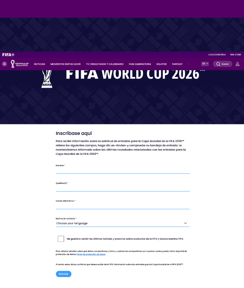 El Mundial de Qatar 2022 terminó hace apenas unos días, y la FIFA ya tiene listo el registro para aquellos que quieran saber información sobre la Copa Mundial 2026 que se celebrará en México, Estados Unidos y Canadá.La Federación habilitó un sitio web dentro de su portal oficial en el que los fanáticos del futbol podrán registrarse para recibir toda la información acerca de la venta de los boletos para los partidos del Mundial 2026."Inscríbase aquí. Para recibir información sobre la solicitud de entradas para la Copa Mundial de la FIFA 2026 rellene los siguientes campos, haga clic en 'Enviar' y compruebe su bandeja de entrada. Le mantendremos informado sobre las últimas novedades relacionadas con las entradas para la Copa Mundial de la FIFA 2026", dice la página.Entre los campos que se deben llenar aparecen el nombre, apellido(s), correo electrónico, Idioma de contacto, y además se debe seleccionar el cuadro que indica si te gustaría recibir las últimas noticias y anuncios sobre productos de la FIFA y futuros eventos.Al final de la página, la FIFA aclara que para obtener detalles sobre qué datos comparten y cómo y cuándo los comparten con sus socios, los aficionados pueden visitar el portal de protección de datos del cual ofrecen un enlace.En 2026, México, Estados Unidos y Canadá albergarán el Mundial. Será la primera vez que la justa tenga una sede triple, la primera que lo reciba Canadá, la segunda Estados Unidos, y México se convertirá en el país que realice la competencia por tercera vez en su historia.OF