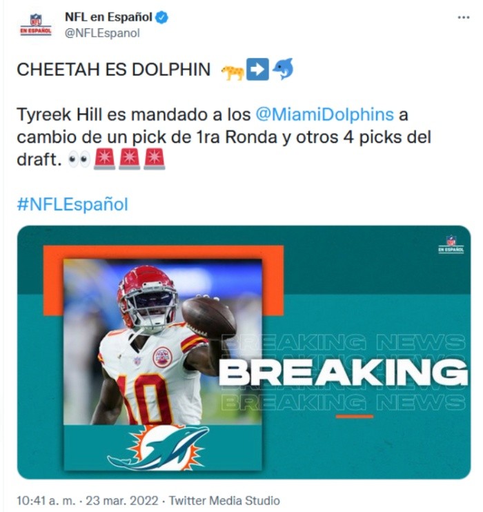 La NFL terminó hace algunas semanas, sin embargo, esta liga no deja de sorprendernos día a día con los movimientos que se han realizado entre las diversas franquicias.Este miércoles la noticia la dieron los Miami Dolphins, pues el equipo de Florida anunció que Tyreek Hill se convirtió en su nuevo receptor luego de llegar a un acuerdo con los Kansas City Chiefs."Cheetah" arribará a Miami para convertirse en el receptor abierto mejor pagado de toda la liga, pues su contrato involucra 20 millones de dólares con 72.2 de ellos garantizados.En contraparte, los de Kansas City Chiefs recibirán cinco selecciones repartidas entre el Draft de 2022 y 2023 de la NFL.En algún momento Hill aseguró que ganaría siete anillos de campeón con los Chiefs, sin embargo, a partir de la próxima campaña su lugar estará en Miami.OF