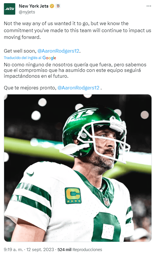 ¡Está fuera! Después de varias horas de incertidumbre, la NFL confirmó este martes la gravedad de la lesión de Aaron Rodgers, quien finalmente se perderá el resto de la temporada con los New York Jets por romperse el talón de Aquiles en el partido frente a los Bills de Buffalo.Uno de los partidos más esperados en el regreso de la NFL era el de los Jets por ver el debut de Rodgers con su nueva camiseta, en horario estelar en Monday Night Football. El MetLife Stadium estaba repleto, su ingreso al campo de juego fue de película, pero no tuvo final feliz.En el primer cuarto sufrió una captura que provocó la lesión y lo forzó a salir del campo en el "carrito de las desgracias".La mañana de ayer lunes, la NFL confirmó la lesión del veterano mariscal de campo y los Jets enviaron un mensaje de ánimo."No es el camino que ninguno de nosotros quería, pero sabemos que el compromiso que tomaste con el equipo nos va a impactar para seguir adelante" publicó el equipo en X.Así, los Green Bay Packers también salen afectados por la lesión de su exquarterback, ya que parte del trato para ceder al jugador involucraba una primera ronda en el Draft del 2024; sin embargo, la condición para que eso suceda era que Rodgers disputara el 65 por ciento de las jugadas de los Jets esta temporada. OF