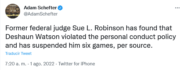 La NFL suspendió hoy lunes 1 de agosto al quarterback de los Cleveland Browns por seis juegos, por violar las políticas de conducta personal de la liga tras las denuncias de abuso sexual presentadas en su contra por 24 mujeres, dijeron dos personas con conocimiento de la decisión.Las personas pidieron no ser identificadas debido a que la decisión no ha sido anunciada. Watson, quien disputó cuatro temporadas con Houston antes de ser traspasado a Cleveland Browns en marzo, resolvió recientemente 23 de las 24 demandas presentadas por masajistas que alegaron acoso sexual y agresión durante citas en 2020 y 2021.Tras enterarse que el fallo era inminente, la Asociación de Jugadores de la NFL difundió un comunicado conjunto con Watson la noche del domingo en el que adelantaron que no apelarán el fallo de la jueza retirada Sue L. Robinson, a cargo de emitir las penalizaciones, e instó a la liga a hacer lo mismo.OF