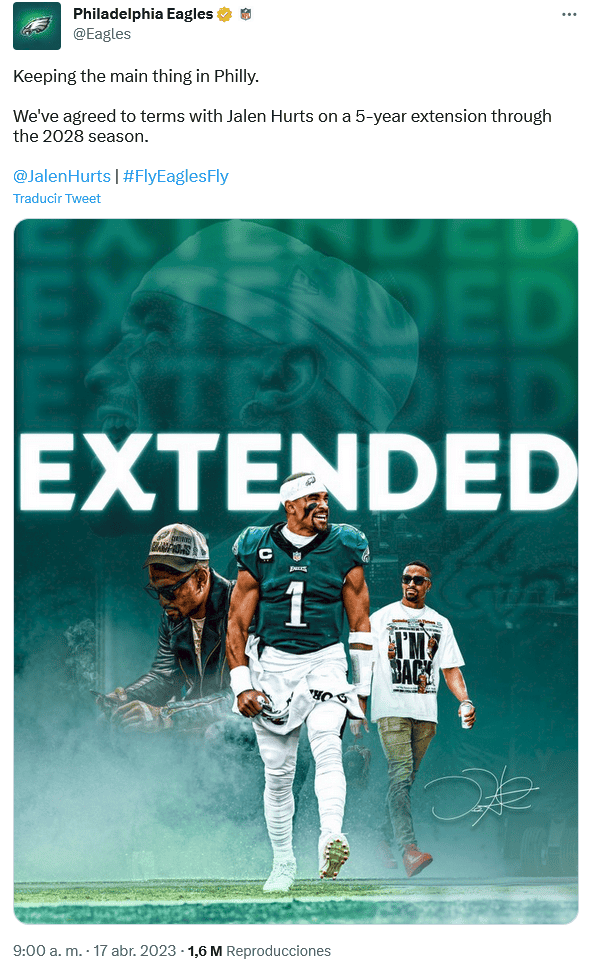 ¡Una millonada! Jalen Hurts, quarterback de Philadelphia Eagles, firmó hoy lunes una extensión de contrato por cinco años a cambio de 255 millones de dólares que lo convierten en el jugador mejor pagado en toda la historia de la NFL."Hay que mantener lo principal en Philadelphia. Hemos llegado a un acuerdo con Jalen Hurts sobre una extensión de cinco años hasta la temporada 2028", fue el anunció que hicieron los Eagles a través de sus redes sociales.El total del contrato de Hurts supera al que el año pasado firmó el mariscal de campo Deshaun Watson con Cleveland Browns por 230 millones de dólares.El acuerdo dice que el pasador tendrá la posibilidad de ganar 274.3 millones de dólares en 2028 si se incluyen incentivos, más los 4.3 millones de su último año de contrato de novato correspondiente a esta temporada 2023.El trato fue negociado por la agente de Hurts, Nicole Lynn, y el gerente general de los Eagles, Howie Roseman.Jalen Hurts arribó a los Philadelphia Eagles seleccionado en la segunda ronda del Draft de la NFL 2020. En su año de novato Hurts comenzó cuatro juegos. En 2021 se hizo con la titularidad.La temporada pasada destacó. Completó el 66.5% de sus pases para 22 anotaciones y seis intercepciones, además de otras 760 yardas y 13 touchdowns por tierra, estadísticas por las que fue nominado a Jugador Más Valioso (MVP) de la temporada.Sus actuaciones lo llevaron a ser seleccionado Pro Bowl por primera vez en su carrera, sin olvidar que con ellas comandó a su equipo al Super Bowl LVII que perdieron ante los Kansas City Chiefs en febrero pasado.En el juego por el campeonato de la NFL el mariscal de campo fue líder en yardas por tierra de Eagles con 70 en 15 acarreos, la más alta cifra conseguida por un quarterback en un Super Bowl. También consiguió tres anotaciones por acarreo, fue el primero en su posición en hacerlo.OF