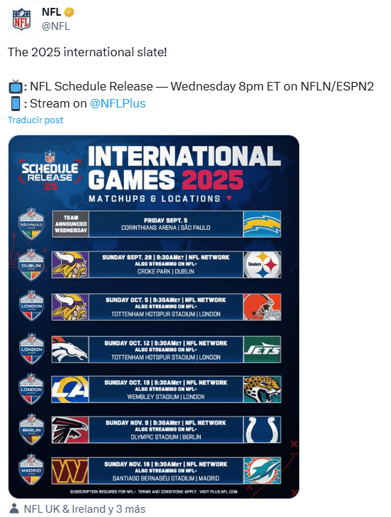 ¡Oficial! Los Vikings de Minnesota tendrán un doble compromiso internacional en 2025, con viajes tanto a Irlanda como al Reino Unidos, ya que la NFL ha programado un récord de siete partidos en el extranjero esta temporada.Los Vikings jugarán contra los Steelers de Pittsburgh en el Croke Park de Dublín el 28 de septiembre y luego volarán a Londres para enfrentarse a los Browns de Cleveland en el estadio Tottenham Hotspur, una semana después, el 5 de octubre."Nuestras experiencias en Londres siempre han sido memorables, así que regresar en 2025 como el primer equipo en jugar partidos internacionales consecutivos en diferentes países era algo que no podíamos dejar pasar", señaló el propietario de los Vikings, Mark Wilf.Los Vikings tienen foja de 4-0 en partidos internacionales correspondientes a la temporada regular. Ese equipo y los Browns también jugaron en Londres en 2017, la última vez que los de Minnesota estaban programados para visitar Cleveland. Eso significa que pasarán 24 años entre visitas a Cleveland, con el próximo en 2033.Los enfrentamientos fueron revelados este martes por la NFL, el segundo en una serie de anuncios de partidos notables en cada una de las emisoras de la liga antes del lanzamiento completo del calendario el miércoles por la noche.También será cuando la liga anuncie al oponente de los Chargers de Los Ángeles y el emisor para su primer juego internacional de la temporada en Brasil, el 5 de septiembre en el estadio del club Corinthians en São Paulo. Allí es donde los Eagles de Filadelfia emprendieron su campaña que les llevó al campeonato del Super Bowl el año pasado con un partido contra los Packers de Green Bay en el fin de semana de apertura.El partido en Brasil se transmitirá de forma gratuita a una audiencia mundial exclusivamente en YouTube y YouTube TV, marcando el debut de la plataforma como emisora en vivo de la NFL. El comisionado, Roger Goodell, y la directora de negocios de YouTube, Mary Ellen Coe, anunciarán al oponente de los Chargers el miércoles en el evento Brandcast 2025 de YouTube en el Lincoln Center en Nueva York.YouTube y la NFL también anunciaron un acuerdo multianual para el partido anual de flag football del Super Bowl que presenta creadores de contenido y artistas con concursos internacionales adicionales tras el éxito del duelo inaugural en febrero, que atrajo más de seis millones de vistas en vivo.En otros juegos internacionales, los Broncos de Denver visitan a los Jets de Nueva York el 12 de octubre en el Tottenham Hotspur en Londres; los Rams de Los Ángeles visitan a los Jaguars de Jacksonville una semana después en el estadio Wembley en Londres; los Falcons de Atlanta visitan a los Colts de Indianápolis el 9 de noviembre en el estadio Olímpico en Berlín; y los Commanders de Washinghton visitan a los Dolphins de Miami el 16 de noviembre en el estadio Santiago Bernabéu en Madrid.Los seis enfrentamientos que se anunciaron estarán todos en NFL Network y se transmitirán en NFL+.*Mantente al día con las noticias, únete a nuestro canal de WhatsAppOF