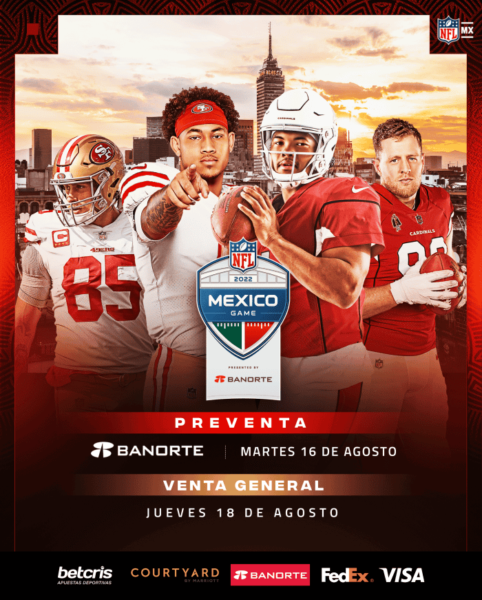 El pasado 4 de mayo se confirmó que el partido de la NFL en México que se jugará este año será el 49ers vs Cardinals, y este viernes se dio a conocer la fecha en la que comenzará la venta de boletos para el duelo en el Estadio Azteca.A través de sus redes sociales, la NFL indicó que la preventa para los clientes de Banorte será el martes 16 de agosto, mientras que la venta general será a partir del jueves 18, ambas, a través del sistema Ticketmaster.Sobre los precios, que aún no se han oficializado, se rumora que estarán entre los 990 a cinco mil 520 pesos en admisión general, y de hasta nueve mil aquellos que incluyen hospitality.Será el próximo 21 de noviembre a las 19:15 horas cuando se dispute el encuentro del Monday Night Football, y vuelvan las actividades de la NFL a México tras una pausa de dos años debido a la pandemia.Se trata de una reedición del primer encuentro que se llevó a cabo fuera de Estados Unidos en el año 2005.El partido 49ers vs Cardinals se transmitirá en vivo por ESPN y Televisa.OF