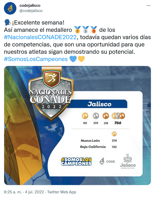 Crece ya a 101 medallas de oro la ventaja que tiene Jalisco sobre Nuevo León en la lucha por el campeonato de los Nacionales CONADE 2022.A falta de 23 días más de competencias, Jalisco se mantiene como el líder absoluto del medallero y se perfilan para ser los campeones de esta primera edición oficial de los Nacionales CONADE.Mientras la delegación jalisciense suma ya un acumulado de 315 preseas doradas, Nuevo León marcha en el segundo sitio con 214 oros, seguido por Baja California con 142 medallas áureas.Todo esto tras la jornada dominical que dejó otro par de victorias para Jalisco. En la categoría Cadetes "A" del taekwondo se colgaron la medalla de oro los jaliscienses Dannan Humberto Hernández (-61 kilogramos) y Guillermo Cortés (-41 kilogramos).Los deportistas jaliscienses han superado las expectativas y podrían romper la marca de más medallas de oro en una misma justa nacional.El récord le pertenece a la delegación de Jalisco luego de haber conquistado 388 oros en la Olimpiada Nacional del 2015.Este año la delegación jalisciense suma ya 315 oros y matemáticamente está a su alcance la posibilidad de imponer una nueva marca nacional.OF