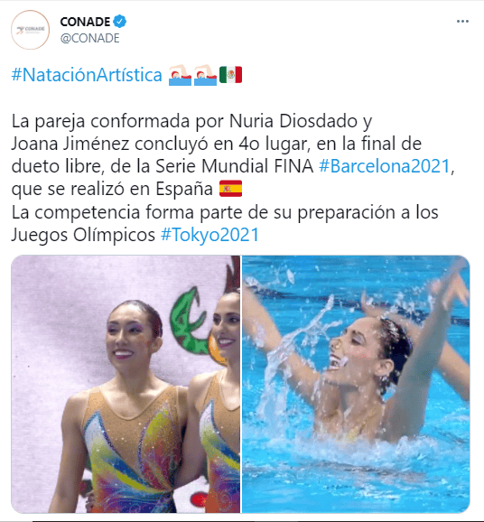La ondina tapatía Nuria Diosdado, en compañía de Joana Jiménez, se posicionaron este domingo en el cuarto lugar de la Serie Mundial de Natación Artística de la Federación Internacional de Natación (FINA).Fue en la especialidad de Dueto Rutina Libre en donde la dupla mexicana se ubicó entre las cuatro mejores de esta competencia que tuvo lugar en la ciudad de Barcelona, España, y que sirvió como preparación de cara a los Juegos Olímpicos de Tokio 2020.Este fue el segundo día con participación destacada por parte de las mexicanas, pues el sábado pasado se ubicaron entre las mejores cinco del evento dentro de la prueba de Dueto Técnico Femenil.Tanto Joana como Diosdado tenían dos años sin participar en algún evento de esta índole, sin embargo han demostrado el buen momento que viven de cara a la máxima justa deportiva del planeta.Fue en los pasados Juegos Panamericanos de Lima 2019 que Joana y Nuria lograron su boleto a Tokio, esto después de colgarse la plata. AJ