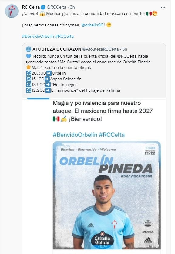Solo unas horas después de ser anunciado como nuevo refuerzo del Celta de Vigo de LaLiga, el mexicano Orbelín Pineda ya rompión un histórico récord con el conjunto celtista. La publicación del Celta de Vigo en donde confirmó la llegada del volante mexicano, fue la más exitosa de toda su historia en cuanto a interacciones se refiere.Así lo dio a conocer una página ajena al equipo, sin embargo el mismo club citó esa publicación y agradeció a la afición mexicana por hacerlo posible, confirmando el dato.Destacar que Pineda tiene pasado en dos de los equipos más populares de México, Cruz Azul y Chivas, además de haber conseguido múltiples títulos en ambas instituciones, lo que lo hace ser sumamente querido por ambas aficiones.Actualmente, la publicación tiene más de 24 mil "me gusta" en Twitter, y la que antes tenía el récord histórico del club llegó a 16 mil 100 likes.JL