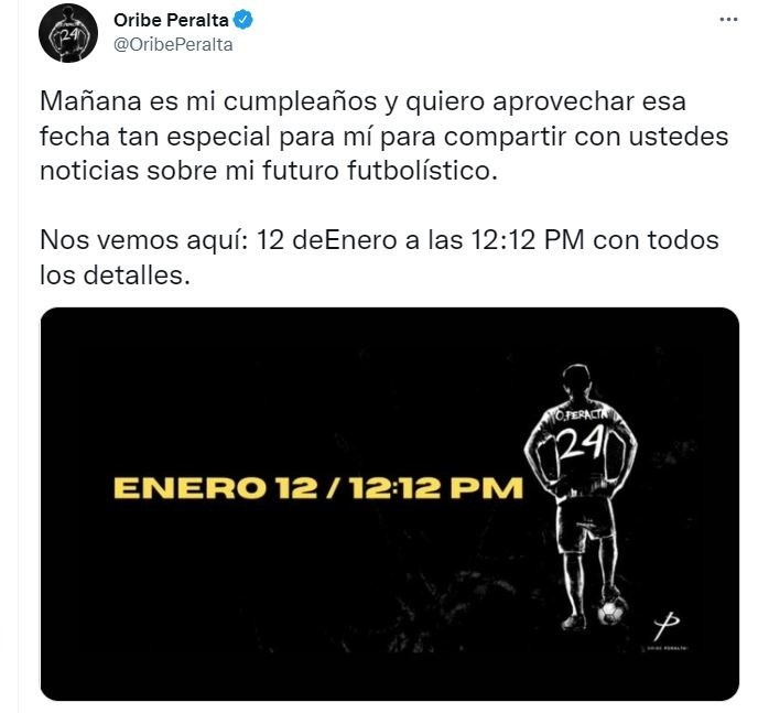 El futuro de Oribe Peralta sigue siendo una incógnita, luego de que en noviembre pasado anunciara su salida de Chivas y el Clausura 2022 diera comienzo sin que el delantero mexicano se incorporara a alguna de las disciplinas. Incluso en las últimas semanas se rumoró que podría fichar por un equipo de El Salvador, específicamente el Alianza, pero finalmente no se ha concretado.En toda esta novela, parece que Oribe Peralta será quien agregue el próximo capítulo y es que a través de sus redes sociales dio a conocer que este miércoles 12 de enero, día en el que cumple 38 años, compartirá noticias sobre su futuro futbolístico. Algunos han empezado a especular con que se trataría del retiro del "Hermoso" y algunos otros creen que el veterano delantero todavía tiene para dar algo de sí mismo en algún destino lejos de la Liga MX.Desde su salida del América con destino hacia las Chivas en 2019, Oribe ha vivido en las sombras, lejos de aquel nivel que lo llevó a ganar títulos con Santos, con las Águilas e incluso con la Selección Mexicana, en donde fue una pieza clave para la obtención de la medalla de Oro en Londres 2012.JL