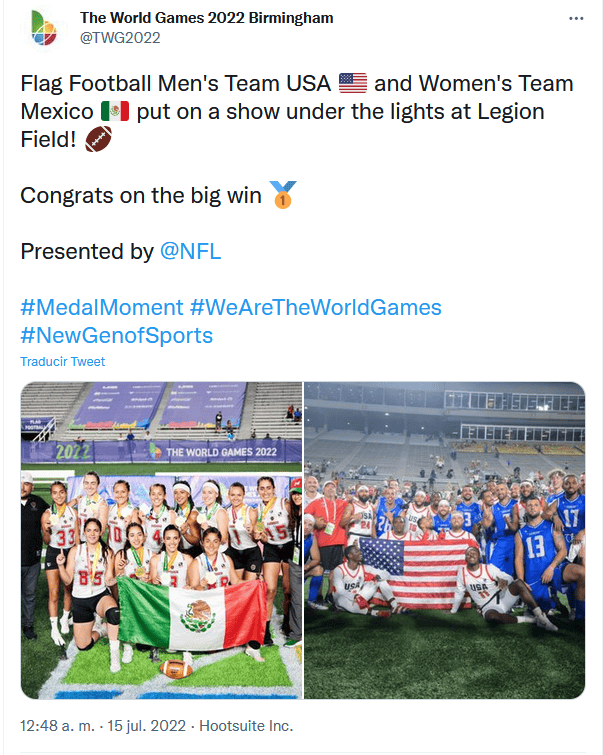Pasaron por encima de las rivales. La selección mexicana femenil de flag football (tocho bandera) conquistó la medalla de oro en los Juegos Mundiales de Birminghan 2022 luego de haber aplastado por pizarra de 36-9 a Estados Unidos en el duelo de la Final.México conquistó así un oro histórico en la rama femenil de este deporte que por primera vez fue incluido en el programa de los Juegos Mundiales.Esta justa deportiva internacional reúne a las disciplinas que por alguna u otra razón no son consideradas como deportes olímpicos.Ya en la rama varonil, la selección azteca se colgó la medalla de bronce al ganar el duelo por el tercer lugar por pizarra apretada de 39-35 ante Austria.Con esta presea de oro, México se metió al Top-10 del medallero general alcanzando la novena posición con cinco medallas doradas, dos de plata y tres de bronce.PARA SABEREl "tocho" bandera es un deporte similar al futbol americano. El formato se reduce a sólo cinco integrantes por equipo y el objetivo aquí es detener a la ofensiva rival quitándoles una de las banderas que portan en ambos lados de la cadera, pero sin hacer uso del contacto físico.OF