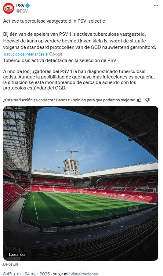 El PSV Eindhoven neerlandés reveló hoy lunes 24 de marzo que uno de los jugadores de su plantilla ha sido diagnosticado con tuberculosis activa, y que está monitoreando la situación, "aunque la posibilidad de nuevas infecciones es baja"."Uno de los jugadores del PSV 1 ha sido diagnosticado con tuberculosis activa. El jugador en cuestión lo está haciendo bien dadas las circunstancias. Aunque la posibilidad de nuevas infecciones es baja, estamos vigilando desde cerca la situación según los protocolos estándar del GGD (departamento de salud pública de la ciudad)", informó el equipo en un comunicado difundido en sus cuentas oficiales en redes sociales.Asimismo, el conjunto rojiblanco destacó que el neumólogo, el personal médico del PSV y la DGG Brabant-Zuidoost tomaron inmediatamente todas las medidas necesarias, empezando por poner en marcha una investigación sobre la fuente de origen del caso, además de informar a los implicados."Por el momento, no hay indicios de que se hayan infectado personas en las proximidades del jugador contagiado", señaló el comunicado.El PSV, que marcha segundo en la Eredivisie (liga neerlandesa) a seis puntos del líder (Ajax), apoya al jugador en todo momento en su recuperación y pidió respeto por su privacidad."El PSV no tiene derecho a ser más específico sobre la identidad del miembro implicado", remató.La tuberculosis es una enfermedad infecciosa causada por una bacteria que generalmente afecta a los pulmones, y la cual se puede propagar por el aire."El riesgo de infección para las personas que rodean al paciente es limitado. En cualquier caso, al aire libre no hay riesgo de infección", afirmó el neumólogo del GGD al club.Este lunes, 24 de marzo, se conmemora el día mundial contra esta enfermedad infecciosa que causa la muerte de un millón de personas al año, según cifras de la Organización Mundial de la Salud (OMS).*Mantente al día con las noticias, únete a nuestro canal de WhatsAppOF
