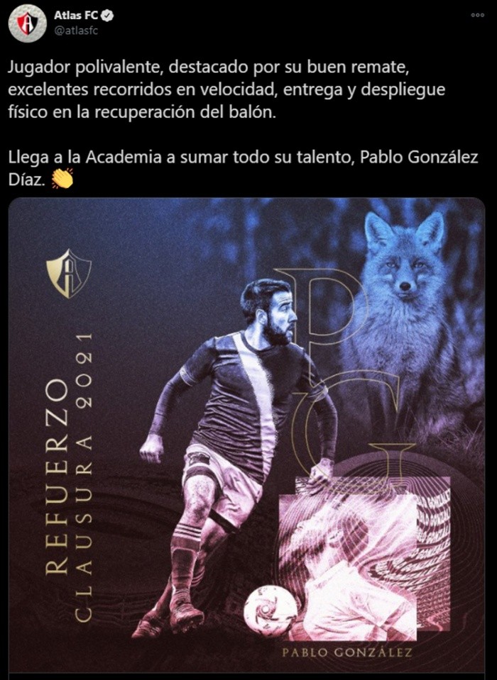 El cuadro de los Rojinegros del Atlas sigue fortaleciendo su plantel de cara al siguiente torneo de la Liga MX y este jueves anunciaron oficialmente al volante mexicano, Pablo González, como su nuevo refuerzo para fortificar la media cancha del equipo comandado por Diego Cocca.Tras poco más de una semana de negociaciones, la directiva del Atlas finalmente concretó el fichaje de Pablo González para sumar así su tercer refuerzo de cara al Torneo Guard1anes 2021, uniéndose a las incorporaciones de Julio Furch y Aldo Rocha."Para transformar se necesita intensidad, cualidad principal que define a nuestro nuevo refuerzo para el Clausura 2021, Pablo González Díaz, jugador polivalente que puede ser utilizado en varias posiciones dentro del campo, destaca por su buen remate de media y larga distancia, excelentes recorridos en velocidad, entrega y despliegue físico en la recuperación del balón", sentenció el comunicado de Atlas.Pablo González llega procedente de La Franja del Puebla, donde prácticamente se consolidó como uno de los jugadores inamovibles del cuadro titular. En el Guard1anes 2020 jugó de inicio en 17 de los 20 partidos que disputaron los poblanos a lo largo del torneo y colaboró con dos anotaciones.De 28 años de edad y originario de la Angelópolis, González surgió de las Fuerzas Básicas de La Franja y debutó con el primer equipo en Liga MX desde el Apertura 2012. Tuvo un breve paso por la división de plata al vestir la camiseta de Cafetaleros de Tapachula en la Temporada 2015-2016, pero después regresó con los poblanos y se convirtió en un referente del equipo hasta conseguir la capitanía.OF