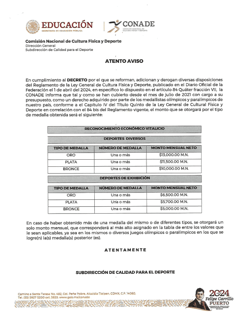 Tras varios días de que comenzaran los Juegos Olímpicos de París 2024, México ya consiguió dos preseas, lo que ha puesto a nuestro país en el puesto número 38 del medallero olímpico con una medalla de bronce y otra de plata.La primera presea de bronce para México la ganó el equipo femenil de tiro con arco, integrado por Alejandra Valencia, Ana Paula Vázquez y Ángela Ruiz, mientras que la medalla de plata la ganó Prisca Awiti en la final de judo femenil.Hasta el corte de esta nota, son las únicas dos medallas que ha ganado México en esta justa olímpica, por ello te compartimos la cantidad que recibirán las y los medallistas de nuestro país tras ganar en París 2024. Para las y los atletas olímpicos y paraolímpicos que ganen una medalla de bronce su premio será de un millón de pesos, el cual será otorgado por la Comisión Nacional de Cultura Física y Deporte (Conade).Mientras que para los que ganen la de plata, será un premio de dos millones, y finalmente la presea de oro será de tres millones de pesos, otorgados por dicha dependencia, esto de acuerdo con lo publicado en el Diarios Oficial de la Federación (DOF) el pasado 29 de diciembre de 2023. De acuerdo con el mismo documento, para las y los medallistas ganadores que compitieron en grupo, el monto se dividirá entre cada integrante. Para estos Juegos Olímpicos de París 2024, la la directora de la Comisión Nacional de Cultura Física y Deporte (Conade), Ana Gabriela Guevara, señaló que las y los atletas que consigan una medalla recibirán un bono dependiendo de la posición, y se prevé se repartirán un total de 30 millones de pesos para los ganadores de este año. Además a este premio económico, las y los mexicanos que ganen alguna presea también recibirán una pensión vitalicia, que de acuerdo con el Conade aquellos que ganen el oro recibirán 13 mil pesos mensuales, de planta 11 mil 500 y los de bronce 10 mil pesos mensuales. NA