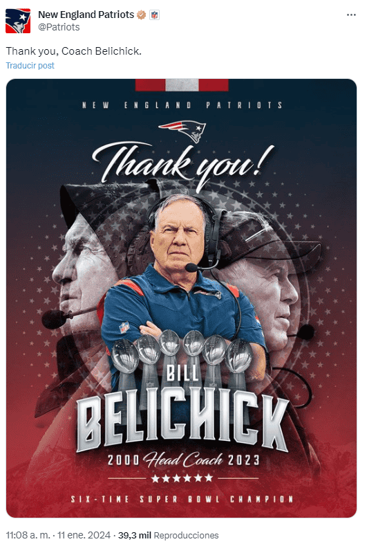 "Gracias", dijeron este jueves los Patriots de Nueva Inglaterra para confirmar la información que estuvo circulando toda la mañana en torno al coach Bill Belichick, quien deja la franquicia tras 24 temporadas en la NFL.En su exitosa trayectoria con los Pats, Belichick ayudó al equipo a ganar 6 anillos de Super Bowl en 9 intentos.Medios como ESPN habían reportado desde temprano la posible salida del entrenador, luego de que se anunciara una rueda de prensa con Belichick y el dueño de los Patriots, Robert Kraft.Belichick fue, junto a Tom Brady, uno de los artífices de los años históricos para la franquicia, que se convirtió en una de las más ganadoras en la NFL. Bill Belichick se fue del equipo de mutuo acuerdo, luego de firmar su peor temporada, con 4 triunfos y 13 derrotas.Con 71 años y 29 como entrenador en la NFL, Belichick es el tercer entrenador en jefe en la historia de la NFL en llegar a 300 victorias de temporada regular, y de hecho, con 333 triunfos, incluyendo los playoffs, es segundo en el récord de victorias de un coach.*Mantente al día con las noticias, únete a nuestro canal de WhatsAppOF