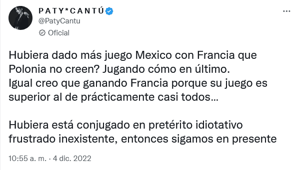 La cantante mexicana Paty Cantú apareció como invitada en el programa deportivo Los Maestros de la Jugada de TUDN, y se volvió tendencia en las redes sociales tanto por su análisis de la Selección Mexicana en el Mundial de Qatar 2022, como por los técnicos que propone para tomar el mando tras la partida de Gerardo "Tata" Martino.En la mesa, Paty Cantú señaló que existen dos técnicos que podrían llegar a la vacante, uno por su experiencia y otro por su juventud, para empezar un nuevo proyecto de cara al Mundial de 2026."¿Por qué no vamos planeando que algunos de ustedes junten un poco experiencia con promesa? O sea porque no, de repente, maestro La Volpe se une con Jimmy Lozano y tú entras de director deportivo (Ricardo Peláez)", dijo Cantú."(Guillermo) Almada con Rafa Márquez, claro que están todos invitados, tenemos con qué, yo no quiero que nos agarre la emergencia del cambio generacional", también dijo. "Y que estén cabeza a cabeza, que haya democracia y no está dictadura. Decisiones en equipo para que se acaben las grillas, que haya confianza, pero creo que llegaron sintiéndose con falta de confianza y el Tata no siento que confiaba en ellos tampoco".Paty cantú ha estado entre las conversaciones de los futboleros en redes sociales debido a las observaciones que publica sobre la Copa del Mundo de futbol.OF
