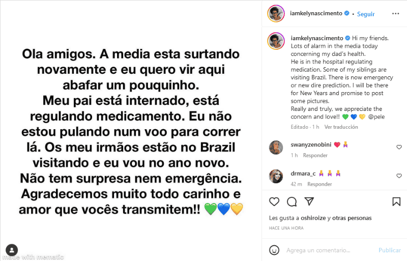 El exfutbolista brasileño Edson Arantes do Nascimento 'Pelé', de 82 años y que desde el año pasado es tratado por un tumor en el colon, volvió a ser hospitalizado este miércoles, según informó una de sus hijas, que aclaró que no se trata de algo grave.El tres veces campeón mundial fue ingresado en el hospital Albert Einstein de la ciudad de São Paulo tras presentar una inflamación generalizada en el cuerpo y está siendo sometido a diferentes exámenes, informaron diferentes medios de comunicación.De acuerdo con el diario O Globo, los médicos que lo atendieron le diagnosticaron un estado de anasarca (inflamación generalizada) e identificaron una insuficiencia cardíaca descompensada.Pese a que ni la asesoría del por muchos considerado mejor futbolista de todos los tiempos ni el hospital dieron informaciones, su hija Kely Nascimento publicó un mensaje en su cuenta en Instagram para tranquilizar a los aficionados y en el que aclaró que no se trata de nada grave."Los medios están enloqueciendo nuevamente y quiero tranquilizar un poco. Mi padre está hospitalizado y le están regulando las medicinas", afirmó Nascimento, de 55 años y que se encuentra en Qatar siguiendo el Mundial de futbol.La hija de Pelé agregó que "no hay nada de sorpresa ni de emergencia" tras aclarar que no está en correrías buscando un vuelo para regresar a Brasil, que sus hermanos están al lado de Pelé en el hospital y que ella tiene previsto visitarlo en año nuevo.Pelé, que en octubre agradeció por estar mejor de salud a sus 82 años, se operó el año pasado de un tumor en el colon detectado durante una batería rutinaria de exámenes.Desde entonces es sometido a un ciclo de sesiones de quimioterapia que le ha obligado a pasar por el hospital varias veces para seguir de cerca su evolución.La salud de Pelé se ha deteriorado en los últimos años también por otras causas, como problemas en la columna, la cadera y la rodilla, que han reducido su movilidad y le han obligado a pasar por el quirófano, además de sufrir alguna crisis renal.Ello ha reducido de forma drástica sus apariciones públicas, aunque se mantiene muy activo en redes sociales.OF