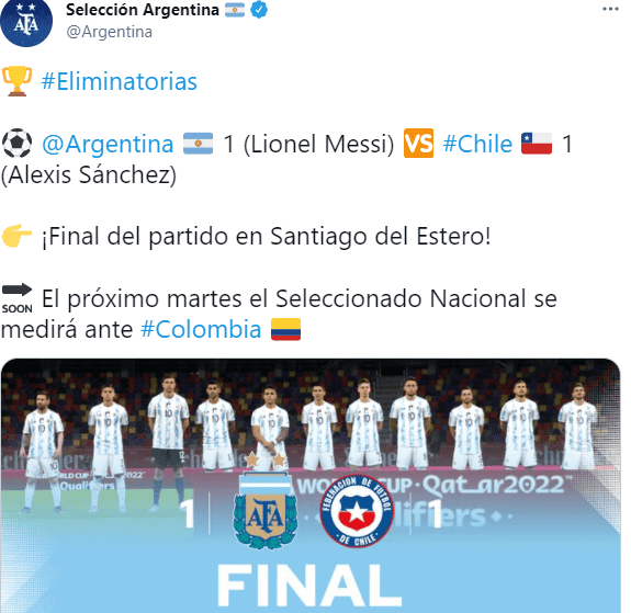Argentina y Chile empataron este jueves 1-1 en el partido de la séptima jornada de las eliminatorias sudamericanas del Mundial de Qatar 2022 que los enfrentó en el Estadio Único Madre de la ciudad Argentina Santiago del Estero.Lionel Messi puso adelante a los locales pero Alexis Sánchez dejó todo como en el principio. El encuentro comenzó con mucho ímpetu por parte de los dirigidos por Lionel Escaloni que buscaron el área del guardameta Claudio Bravo.En esa búsqueda llegó una jugada en el minuto 22 del primer tiempo en la que Lautaro Martínez fue derribado en el área chica, pero no fue el árbitro central venezolano Jesús Valenzuela quien marcó el cobro desde el punto penal, sino el VAR el que le dio el cobro a a la Albiceleste.El balón lo tomó el capitán Lionel Messi, quien desubicó a Bravo en el minuto 23 y fijó el 1-0. Fue su gol número 72 con la Albiceleste.Pero Chile se decidió a atacar y en el minuto 35 Alexis Sánchez anotó el empate. El segundo tiempo fue de más dominio para Chile que aguanto bien los últimos minutos y sacó el punto de visitante que necesitaba para llegar a cinco puntos.Argentina se enfrentará el 8 de Mayo con Colombia en Barranquilla y Chile recibirá como local ese mismo día a Bolivia en Santiago. AJ