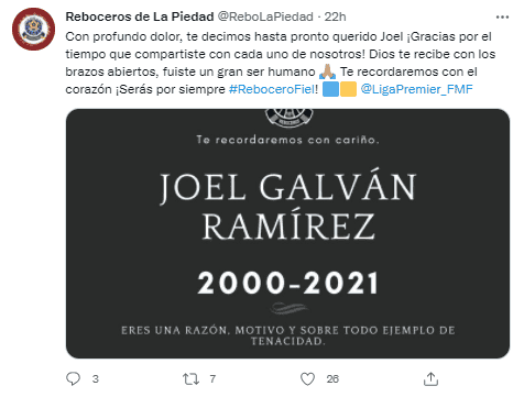 Joel Galván, jugador de los Reboceros de La Piedad, de la Liga Premier de México, murió ahogado mientras se encontraba en la presa La Jamacua ubicada en Pénjamo, en Guanajuato, el pasado domingo. Presidenta de Tanzania desata polémica con comentarios sobre jugadoras de futbol Los informes de prensa señalan que Galván, después de disputar un partido con su equipo, fue a la presa a pasar la tarde con familiares y amigos en la comunidad de La Estrella donde se metió a nadar, pero de un momento a otro se hundió y ya no pudo salir. Sus amigos y familiares fueron por él, pero cuando lo encontraron ya no pudo recuperarse y en el hospital al que fue traslado fue declarado sin vida. El equipo de La Piedad, se manifestó vía redes sociales: "Con profundo dolor, te decimos hasta pronto querido Joel ¡Gracias por el tiempo que compartiste con cada uno de nosotros! Dios te recibe con los brazos abiertos, fuiste un gran ser humano. Te recordaremos con el corazón ¡Serás por siempre #ReboceroFiel!". ¿Quieres saber más?Si quieres tener más contenido, más imágenes y aún más noticias, entonces descarga INFORMAPlus, la aplicación digital de EL INFORMADOR, donde tenemos materiales exclusivos para ti. Descarga la aplicación y pruébala GRATIS por treinta días. Para iOS: https://apple.co/35jaVgbPara Android: https://bit.ly/3gwVSEV Si eres suscriptor de EL INFORMADOR tu acceso está incluido, solicítalo al 33 3678-7777 AA