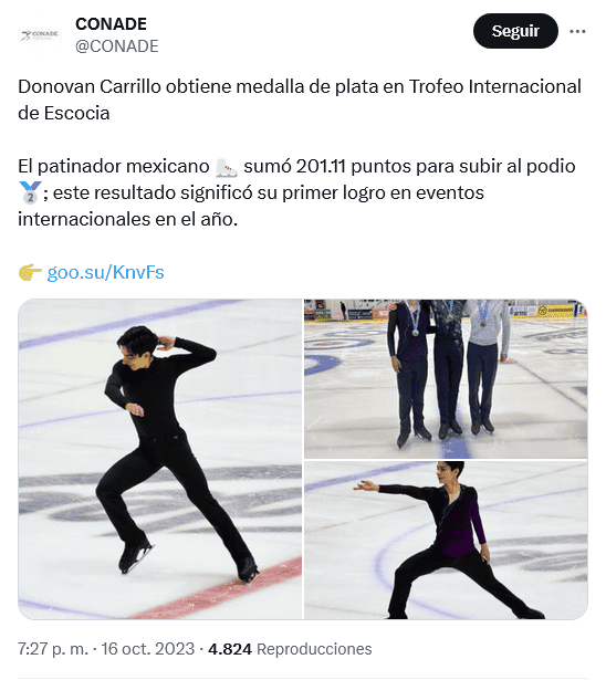 Este martes, el patinador artístico jalisciense Donovan Carrillo logró la medalla de plata en el Torneo Internacional de Escocia.Con una suma de 201.11 puntos, Donovan Carrillo se ubicó en el segundo lugar de la competencia. En programa corto acumuló 73.36 unidades, y en el libre, tras presentar la rutina con los temas "Bésame mucho", "Historia de un amor" y "Cuba 2012" logró 127.75 unidades más.La medalla de oro fue para el austriaco, Mauricio Zandron con 216.28 puntos y el bronce para el británico Ken Fitterer con 191.00 puntos.Se trata de la primera medalla de la temporada para el patinador y orgullo mexicano. OF