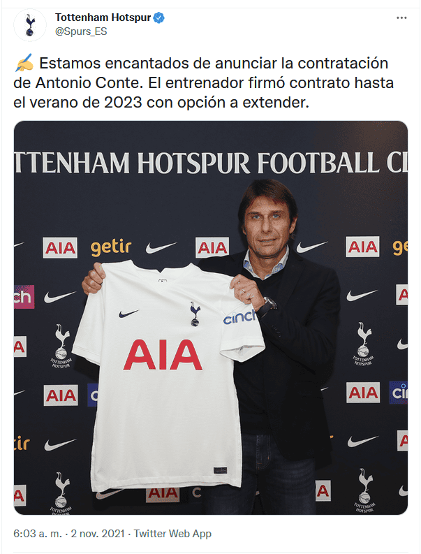 El equipo de la Premier League, el Totttenham, anunció este martes la designación del italiano Antonio Conte como nuevo entrenador, por un periodo de un año y medio."Estamos encantados de anunciar hoy la nominación de Antonio Conte en el puesto de entrenador principal, con un contrato hasta 2023, que comprende una opción de prolongación", escribió el conjunto londinense en un comunicado, un día después del cese del portugués Nuno Espirito Santo.Ayer, un día después de la derrota en casa (3-0) contra Manchester United, los londinenses, octavos del campeonato, pero a dos puntos de las plazas clasificación a la Champions League, cesaron a Nuno Espirito Santo, quien estuvo solo unos meses en el puesto."Antonio ha ganado títulos en Serie A, incluido tres 'Scudetti' con la Juventus, en Premier League (con Chelsea) y ha dirigido a la Selección de Italia, a la que condujo a los cuartos de final de la Eurocopa 2016", señaló el Tottenham.Antonio Conte tendrá la tarea de intentar despertar a un equipo que no ha conseguido brillantes resultados desde hace dos años, cuando se marchó el argentino Mauricio Pochettino del banquillo, después de que el rosarino dejara una buena impresión, conduciendo al Tottenham a una final de la Champions League.OF