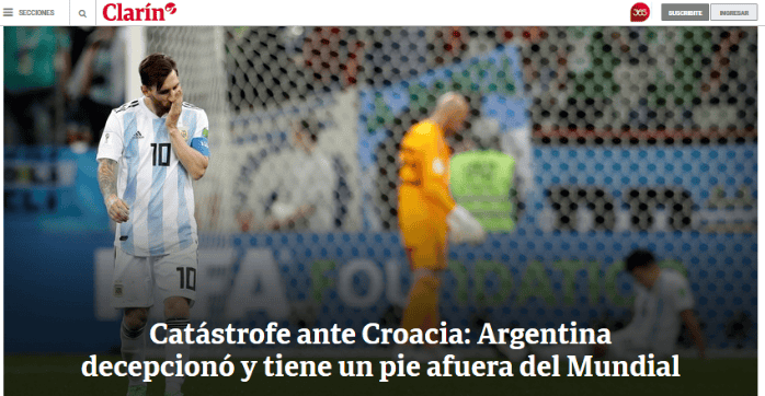 Los principales medios de comunicación de Argentina narraron perplejos cómo la Albiceleste cayó este jueves "a pedazos" ante Croacia en la fase de grupos del Mundial de Rusia y quedó en una situación de "catástrofe" que deja al equipo de Leo Messi con "un pie afuera" del campeonato."Argentina pasó vergüenza con Croacia y puso en jaque su futuro en el Mundial", publicó el diario La Nación en su edición digital, que acompañó de una enorme foto del capitán cabizbajo y de espaldas, una imagen que se replicó de forma similar en prácticamente todos los medios gráficos o audiovisuales del país.Clarín también se inclinó por una instantánea del rosarino y un contundente: "Catástrofe ante Croacia". "Argentina decepcionó y tiene un pie afuera del Mundial. Fue goleada 3-0 y no tuvo respuestas en ningún momento del partido. Un error gravísimo del arquero (Willy) Caballero fue el comienzo de la pesadilla. Messi casi no la tocó y hubo insultos para (Jorge) Sampaoli", añade el mismo diario en su página principal.En el mismo sentido, y como contundente crítica al seleccionador, el canal de televisión Crónica colocó a toda pantalla, tras el partido, un gigante "¿A qué hora renuncia Sampaoli?""Argentina sufrió una humillante derrota ante Croacia y quedó al borde de la eliminación", sentenció el digital Infobae, mientras que el portal deportivo Olé optó por definir lo ocurrido con un "Caballeros de la angustia" junto a una imagen del portero tapándose la cara."Argentina se cayó a pedazos tras el error del arquero y perdió 3-0 con Croacia. Un papelón que la deja al borde de la eliminación", añade el mismo diario.El canal de televisión TN destacó que Argentina está "al borde del fracaso" por contar solamente con un punto, fruto del empate del pasado sábado ante Islandia.Como elemento común a todos los medios, proliferan las cábalas acerca de qué necesita Argentina para pasar de ronda, así como los escenarios posibles tras la dura derrota, que ha tirado por el suelo los ánimos de una afición que ve alejarse la esperanza de que el equipo logre la Copa del Mundo que ya consiguió en 1978 y 1986.