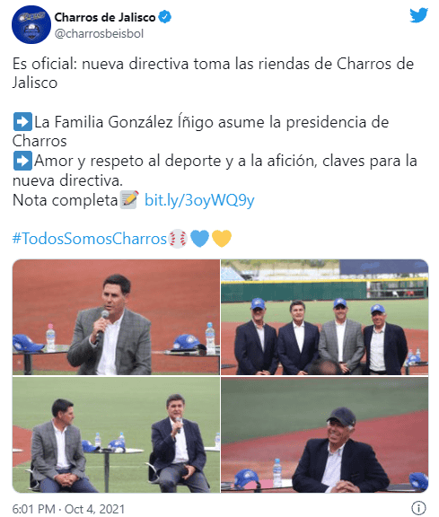 Con la firma ante notario público todavía pendiente para formalizar el cambio, este lunes la Liga Mexicana del Pacífico presentó a la nueva directiva de los Charros de Jalisco, encabezada por Íñigo González Covarrubias, como su nuevo presidente ejecutivo.En conferencia de prensa realizada en el Estadio Panamericano, Omar Cañizales, presidente de la LMP, presentó a los nuevos administradores de las riendas del equipo caporal, con González Covarrubias al frente, junto a Juan Carlos González Íñigo, como asesor de presidencia de Charros de Jalisco; Luis Alberto González Íñigo, como director general, además de José Luis González Íñigo como nuevo presidente de consejo de administración, quien estuvo ausente en el evento.“La propuesta fue el reconocer el trabajo y los logros hechos con el equipo, teniendo reuniones uno a uno y en algunos casos en conjunto, porque queríamos un proyecto serio y sólido”, declaró González Covarrubias, presidente ejecutivo de Charros de Jalisco.Junto a Cañizales a los nuevos directivos, también estuvieron presentes Armando Navarro y Leonardo Plasencia, integrantes de la directiva saliente.“Durante 20 años luché con todo por el regreso del béisbol a Guadalajara, hasta que en el 2014 se logró el retorno, y ahora luché con todo para que no se fuera. Ya le di vuelta a la página, lo que pasó, pasó y gracias a la familia González, que es gente de béisbol y gente buena, les deseo el mejor de los éxitos, (…) mi ciclo como directivo terminó y ahora toca disfrutar como aficionado”, comentó Navarro, conmovido por despedirse del que fue su proyecto.Por su parte, Omar Cañizales aclaró que los dueños de los 20 equipos que conforman la Liga estuvieron de acuerdo con el cambio de estafeta administrativa en Charros.“Estamos de plácemes porque la familia González Íñigo, encabezada por don José Luis, tomaron la valiente decisión de continuar en Jalisco, apoyando al club Charros de Jalisco. Todos los dueños de los demás equipos están felices”, explicó.Aclaró que será hasta hoy a las 10:00 horas cuando se formalice ante notario, el cambio de riendas de la franquicia.Más tarde, la oficina de Salvador Quirarte, el otro socio de la anterior administración junto Juan Carlos Rendón Mora, Álvaro Quirarte Villaseñor, Ararggo Gómez Sierra y Arturo Blanco Díaz, integrantes del Holding que controló la franquicia, precisó que hasta anoche la negociación se encontraba aún abierta.“En relación al status de este conjunto de organizaciones mercantiles, manifestamos que aún continuamos en la negociación, la última fase de ella, con los detalles finales que aunque en efecto son pocos, son los que establecerán la consumación de la transferencia de los derechos que sobre la franquicia , paquete marcario y uso del estadio aún tenemos los socios con mayor número de capital en las diversas empresas mediante las que se opera a Charros de Jalisco, lo que está terminándose y esperamos quede resuelto durante este día para ser firmado mañana a primera hora ante fedatario público y sea hasta ese momento en que formalmente exista un nuevo grupo de accionistas al frente del equipo y en razón de ello una nueva directiva, lo cual estaremos detallando el mismo día de mañana”, informó Quirarte.¿Quieres saber más?Si quieres tener más contenido, más imágenes y aún más noticias, entonces descarga INFORMAPlus, la aplicación digital de EL INFORMADOR, donde tenemos materiales exclusivos para tí.Descarga la aplicación y pruébala GRATIS por treinta días. Si eres suscriptor de EL INFORMADOR tu acceso está incluido, solicítalo al 33 3678-7777AF