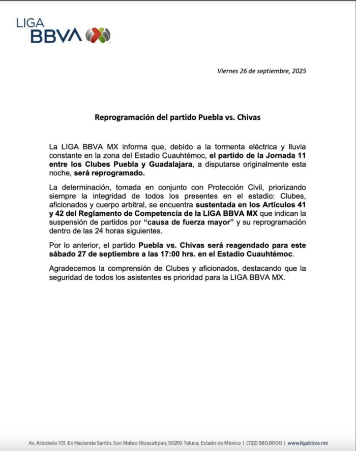 La Liga BBVA MX informó la reprogramación del encuentro entre Puebla y Chivas correspondiente a la Jornada 11 del torneo Apertura 2025, debido a las condiciones climáticas adversas registradas la noche de este viernes 26 de septiembre en la capital poblana.El duelo, que originalmente se disputaría en el Estadio Cuauhtémoc, fue pospuesto como consecuencia de una tormenta eléctrica acompañada de lluvias intensas que comprometieron la seguridad de los asistentes, jugadores y cuerpo arbitral. La decisión fue tomada en conjunto con las autoridades de Protección Civil, priorizando la integridad de todos los presentes. La medida se basa en los artículos 41 y 42 del Reglamento de Competencia de la LIGA BBVA MX, los cuales establecen que, ante una “causa de fuerza mayor”, los partidos pueden ser suspendidos y deberán ser reprogramados dentro de las 24 horas siguientes.Por tal motivo, el partido se llevará a cabo este sábado 27 de septiembre a las 17:00 horas en el mismo recinto, el Estadio Cuauhtémoc.MF