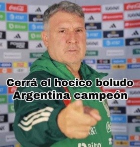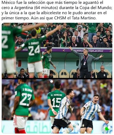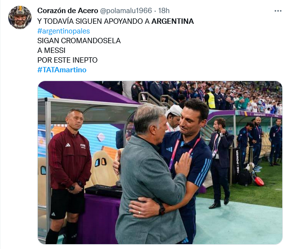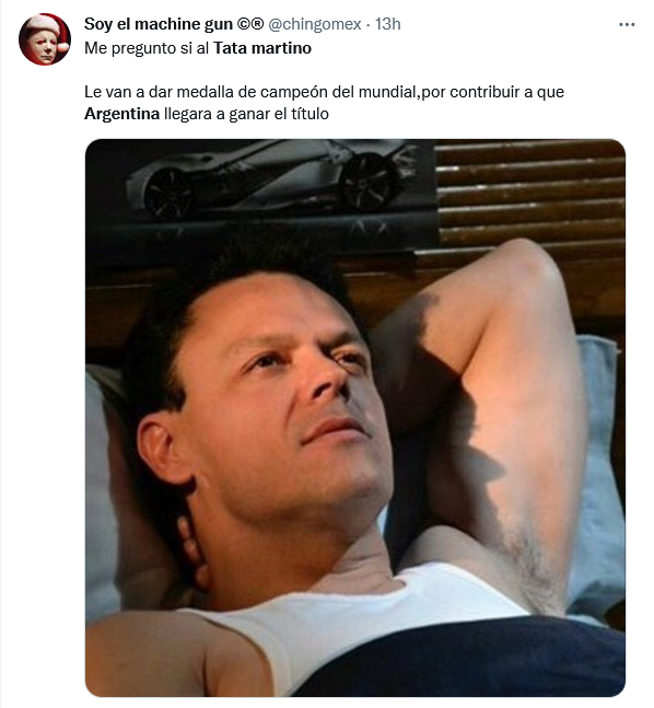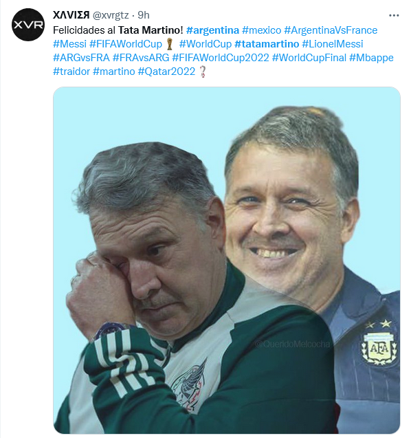 La afición mexicana sigue muy molesta con Gerardo "Tata" Martino y más ahora que la Selección de Argentina se coronó en la Copa del Mundo de Qatar 2022.La albiceleste junto a Lionel Messi levantó el trofeo de la FIFA en el Estadio Lusail, algo que la gente en nuestro país calificó como "el plan perfecto" del Tata Martino.Y es que tras la tanda de penaltis que le dio a la selección sudamericana su tercer campeonato del mundo, los fans mexicanos reventaron en redes sociales al ahora ex entrenador de la Selección Mexicana.El cuadro mexicano en la fase de grupos tuvo en sus manos la oportunidad de eliminar a la albiceleste, pero el cuestionado planteamiento de Martino no lo permitió.OF