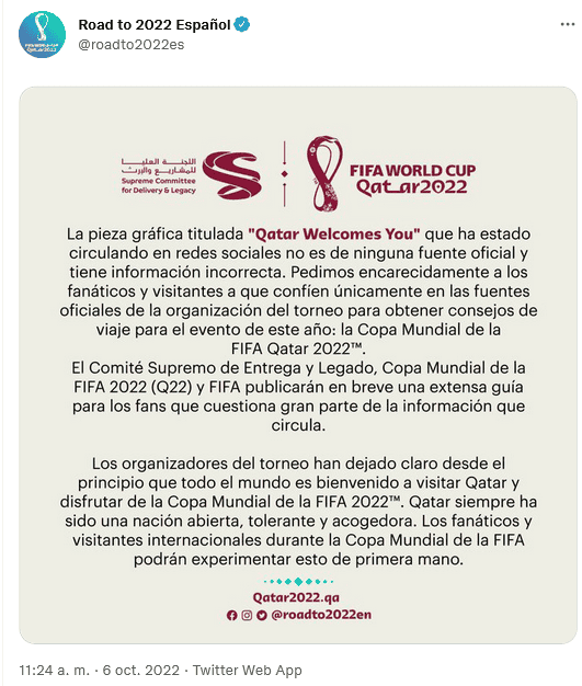 A poco más de un mes de que inicie el Mundial de Qatar 2022, en redes sociales circulan todo tipo de imágenes que buscan motivar a los espectadores que esperan ansiosos, pero también hay algunas que pretenden polarizar el evento. Un ejemplo de estos fue un supuesto cartel en el que se anuncian las acciones que estarán prohibidas durante la competencia, pero que los propios organizadores se han encargado de desmentir.En el falso cartel, se observan las diferentes actividades que los visitantes de Qatar no podrán realizar, sin embargo, la FIFA ya aclaró en sus redes sociales lo que pasará, pues se trata de falsa publicidad.Estas advertencias, que inician con el mensaje "Qatar te da la bienvenida" son:También sugiere "refleja tu respeto por la religión y la cultura del pueblo qatarí evitando estos comportamientos".Si bien, algunos de estos señalamientos sin son pedidos para evitarse durante el Mundial, la verdad es que no se trata de un cartel promocionado por la FIFA."La pieza gráfica titulada 'Qatar Welcomes You' que ha estado circulando en redes sociales, no es de ninguna fuente oficial y tiene información incorrecta. Pedimos encarecidamente a los fanáticos y visitantes a que confíen únicamente en las fuentes oficiales de la organización del torneo para obtener consejos de viaje para el evento de este año: la Copa Mundial de la FIFA Qatar 2022".El Mundial de Qatar 2022 iniciará el próximo domingo 20 de noviembre, y el partido inaugural será entre la Selección local vs Ecuador, en punto de las 10:00 horas, tiempo del centro de México.OF