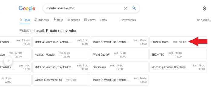 ¿Será una predicción? Usuarios aseguran en redes sociales que Google ya reveló, sin querer, cuál será la final de la Copa del Mundo de Qatar 2022 a menos de dos meses de que inicie el torneo. Imágenes de lo que arroja el buscador se han vuelto virales y han abierto un acalorado debate en Internet."Si buscan en Google el estadio donde se jugará la final del mundial, ya pusieron los países que la jugarán. Que onda?. Está arreglado el Mundial?", escribió el usuario @__ffsss__."Que onda? El mundial está arreglado o es información q puede modificarse? Miren los equipos q salen como finalistas si buscan en Google estadio Lusail próximos eventos. El 18/12 la final. Lo dijo un chico en otra red social y lo busque y es cierto", escribió por su parte @Kinggorilas2.Mientras algunos aficionados del futbol ya alistan las quinielas con los amigos o los compañeros del trabajo, otros se han atrevido a buscar posibles combinaciones en los encuentros de la segunda fase de la competencia, tratando de acertar sus predicciones. Entre ellos, hay quienes se han arriesgado a buscar "Estadio Lusail eventos" en el navegador, y de manera sorprendente éste revela que el partido que se jugará el día de la final, programada el próximo 18 de diciembre tendrá como estrellas a dos de las selecciones candidatas a ganar la Copa.Pero no, entre los equipos no están los siempre favoritos Lionel Messi o Cristiano Ronaldo. Según Google, los equipos que buscarán ser campeones en Qatar 2022 serán Brasil y Francia.El 20 de noviembre arrancará el primer mundial que se dispute en Medio Oriente, y en torno a su organización se han desatado numerosos debates, entre estos, el que Google haya revelado a los protagonistas de la esperada final de manera accidental. Aunque claro, la información no es para nada oficial y solo podría ser error del buscador.OF