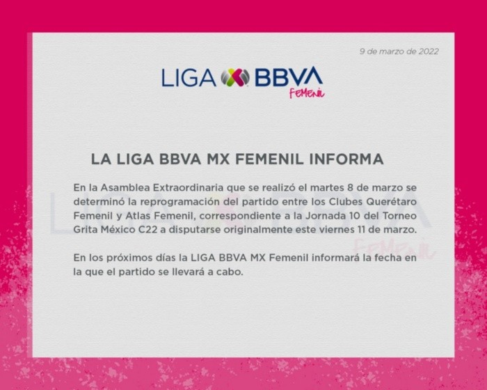 Este miércoles 9 de marzo, la Liga MX Femenil dio a conocer que en la Asamblea extraordinaria que se realizó ayer se determinó que el partido Querétaro vs Atlas sea reprogramado.El encuentro, correspondiente a la Jornada 10 (J10) del Torneo Clausura 2022, se disputaría originalmente este viernes 11 de marzo en el Estadio Olímpico Alameda, sin embargo, debido a los acontecimientos ocurridos el sábado 5 en La Corregidora se decidió cambiarlo de fecha.En un breve comunicado, la Liga MX informa que la nueva fecha se dará a conocer en los próximos días.Tras la riña en La Corregidora, ayer se dio a conocer que el equipo de los Gallos Blancos jugará un año a puerta cerrada, sin embargo, la medida será aplicables para todos los juegos de local en cualquier categoría, lo que incluye al conjunto femenil.OF