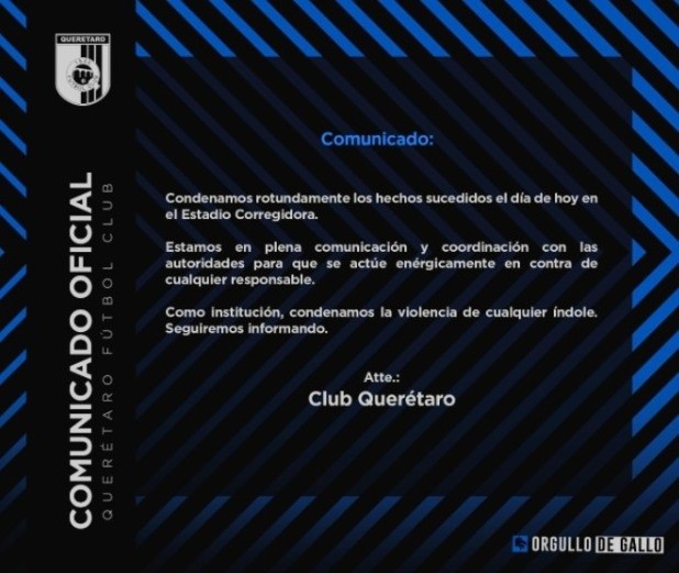 Tres horas después de que fuera suspendido el partido de Querétaro contra Atlas debido a la violencia que se originó entre porristas asistentes al Estadio Corregidora, el Club Querétaro emitió un comunicado en el que condenó el hecho y pidió castigar a los culpables."Condenamos rotundamente los hechos. Estamos en plena comunicación y coordinación con las autoridades para que se actúe enérgicamente en contra de cualquier responsable".Sin embargo, no dio a conocer ninguna información sobre lo sucedido."Como institución condenamos la violencia de cualquier índole. Seguiremos informando".La condena llegó luego de que primero se pronunciaran la Liga MX, el propietario del Atlas Alejandro Irarragorri, los Rojinegros y los gobernadores de Querétaro y Jalisco, entre otros.La Liga Mx dijo que pondría un castigo ejemplar tras lo ocurrido.El presidente del Consejo directivo de Grupo Orlegi, Alejandro Irarragorri, calificó lo sucedido como "inaceptable, lamentable y contrario a la esencia del fútbol y su rol en la sociedad".Los gobernadores de Jalisco y Querétaro señalaron que ya revisan el caso para apoyar a los familiares de las víctimas de la violencia ocurrida y analizar cómo se procederá con el caso.