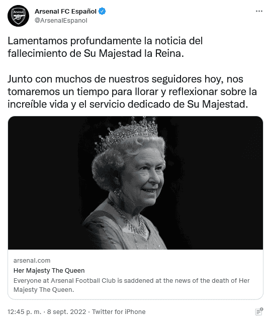La reina Isabel II falleció este jueves, una figura de autoridad mundial que siempre mostró su gusto por el futbol y en especial por uno de los clubes de la Premier League.La monarca, quien en su juventud desarrolló la actividad de la equitación, era una gran aficionada del Arsenal, todo a la extraordinario relación con Arsene Wenger.Isabel II nació en 1926, por lo que es de las pocas personas que vieron y celebraron los 13 títulos que tiene el Arsenal en la Premier League.La relación entre la institución y la figura de la realeza siempre fue tan importante y fuerte, que fue considerada para inaugurar el Emirates Stadium en 2006, pero una molestia en la espalda le impidió asistir.La familia real vive en el Palacio de Buckingham, ubicado en la ciudad de Londres, en donde también juegan clubes como Chelsea, Crystal Palace, Tottenham y West Ham.OF