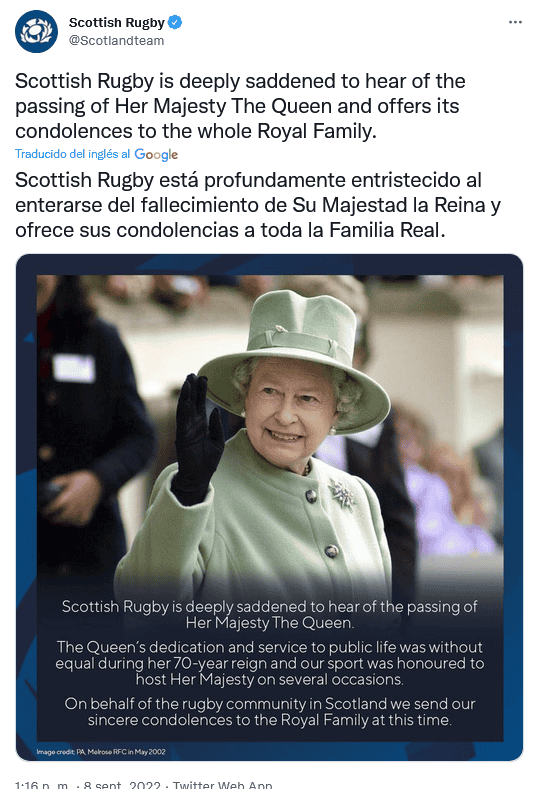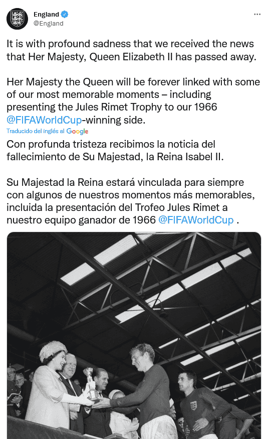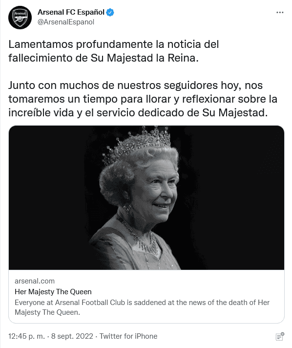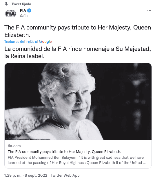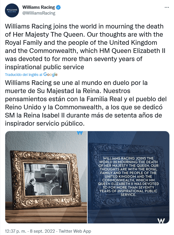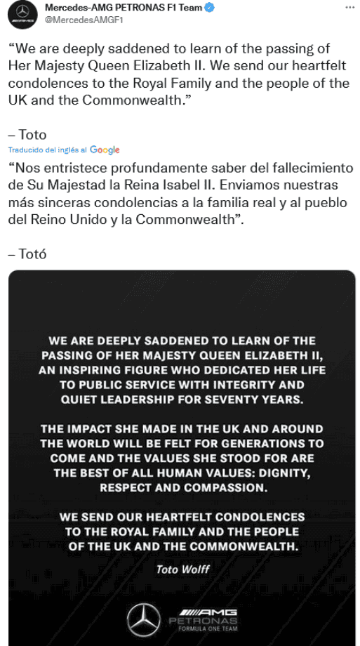 Este jueves 8 de septiembre, la Familia Real informó que la reina Isabel II falleció pacíficamente en Balmoral, en Escocia, y de inmediato, las reacciones del mundo del deporte no se hicieron esperar.La Fórmula 1 comunicó en su página oficial que hoy está de luto por la "muerte de Su Majestad la Reina Isabel II, del Reino Unido de Gran Bretaña e Irlanda del Norte, que ha fallecido a los 96 años".Señalan que al frente de los tributos del deporte a la reina Isabel II estuvo el presidente y director ejecutivo de Fórmula 1, Stefano Domenicali, quien dijo: "La Fórmula 1 lamenta el fallecimiento de Su Majestad la Reina Isabel Il"."Durante más de siete décadas dedicó su vida al servicio público con dignidad y devoción e inspiró a tantos en todo el mundo. La Fórmula 1 envía su más sentido pésame a la Familia Real y al pueblo del Reino Unido y la Commonwealth".En su cuenta de Twitter, el piloto británico George Russell escribió: "Me entristece mucho escuchar sobre el fallecimiento de Su Majestad la Reina Isabel II. Su devoción por nuestro país y su amable liderazgo inspiraron a tantas generaciones de personas en el Reino Unido y en todo el mundo".La liga de futbol inglés publicó en sus redes sociales: "La Premier League está profundamente entristecida al enterarse del fallecimiento de Su Majestad la Reina, Isabel II. Nuestros pensamientos y condolencias están con la familia real y todos los que lloran la pérdida de Su Majestad en todo el mundo".Por su parte, organizadores del torneo de Grand Slam de tenis, Wimbledon, dijo en su cuenta de Twitter: "Deseamos transmitir nuestro más sentido pésame a la Familia Real por el triste fallecimiento de Su Majestad la Reina". OF