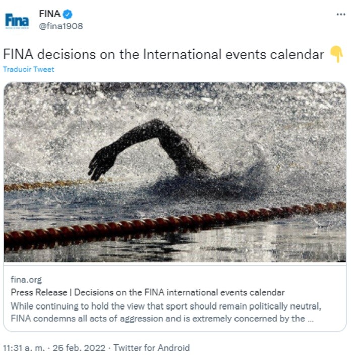 Este viernes 25 de febrero, la Federación Internacional de Natación (FINA) anunció que quedan cancelados los partidos de la Liga Mundial de Waterpolo, así como de las Series Mundiales de Natación Artística y de Clavados previstas en Rusia en los meses de marzo y abril como consecuencia del conflicto militar entre Rusia y Ucrania.Aunque insistió que "el deporte debe permanecer políticamente neutral", la FINA no dudó en "condenar todos los actos de agresión" y se mostró "extremadamente preocupada" por la escalada del conflicto en Ucrania."Aunque seguimos manteniendo la opinión de que el deporte debe permanecer políticamente neutral, la FINA condena todos los actos de agresión y está extremadamente preocupada por la escalada del conflicto en Ucrania", expresó la Federación Internacional en un comunicado.De este modo, no se llevará a cabo como estaba programado el encuentro de la Liga Mundial de Waterpolo masculina del próximo 8 de marzo entre las selecciones de Rusia y de Grecia en San Petersburgo.La FINA también anunció la "cancelación" de las pruebas de las Series Mundiales de Natación Artística y de Clavados que estaban programadas del 8 al 10 de abril en la localidad de Kazán."En el caso de que se pueda encontrar una solución para la disputa de estos eventos, se comunicará tan pronto como sea posible", anunció la Federación Internacional, que se "comprometió" a "proporcionar todo el apoyo que pueda dar a los miembros de la familia acuática afectados por esta situación".OF