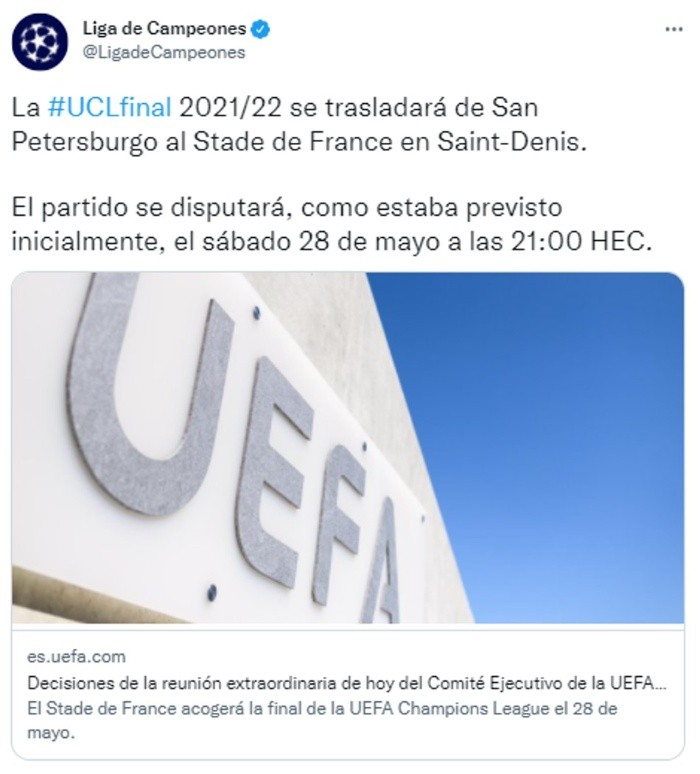 Cambios esperados: Este viernes, la UEFA decidió que la ciudad de San Petersburgo no sea la sede de la final de la Champions League 2022, luego de la invasión de Rusia en Ucrania, y el encuentro se jugará en el Stade de France en Saint-Denis, Francia, a las 14:00 horas tiempo del centro de México del 28 de mayo.El Comité Ejecutivo del organismo, convocado de emergencia tras la incursión militar rusa en territorio de Ucrania y "la grave escalada de la situación de seguridad en Europa", informó la medida después de condenar enérgicamente la acción.El Ejecutivo, del que forman parte entre otros el presidente de la Federación Rusa, Alexander Dyukov, y el de Ucrania, Andrii Pavelko, también decidió que los equipos y las selecciones nacionales rusas y ucranianas que participan en competiciones de la UEFA deberán jugar sus partidos de local en sedes neutrales hasta nuevo aviso.En un comunicado, la UEFA mostró su agradecimiento y reconocimiento al presidente de Francia, Emmanuel Macron, por su apoyo personal y su compromiso para que la final de la Champions League se traslade a su país en un momento de crisis sin precedentes."Junto con el gobierno francés, la UEFA apoyará plenamente los esfuerzos de las múltiples partes interesadas para garantizar la provisión de rescate para los jugadores de futbol y sus familias en Ucrania, que se enfrentan a un terrible sufrimiento humano, destrucción y desplazamiento", añadió.El cambio de sede de la final de la Champions de este año es el tercero que la UEFA decide de forma consecutiva, después de los de las temporadas anteriores por la pandemia.En la temporada 2019-2020, en la que el título se iba a definir en Estambul, se disputaron a partido único los encuentros desde cuartos de final en Portugal y la final se jugó en la Luz con victoria del Bayern Múnich sobre el PSG.Y en la campaña 2020-2021, en la que de nuevo la final se iba a jugar en la ciudad turca, el título se lo disputaron el Chelsea, que fue campeón, y el Manchester City, en el estadio Do Dragao de Oporto.Después de este segundo cambio y con el estadio Gazprom Arena ya elegido para la final de este año, la UEFA decidió otorgar la sede de la final de 2023 al Estadio Olímpico Atatürk de Estambul, y que la ciudad turca acogiese los sorteos de la fase de grupos de la Champions, la Europa League y la Conference League tanto de esta temporada y la próxima, 2022-2023.La final de la Champions 2023, que originalmente se iba a realizar en Múnich, se trasladó a 2025 y el estadio londinense de Wembley será el escenario de edición 2024. OF