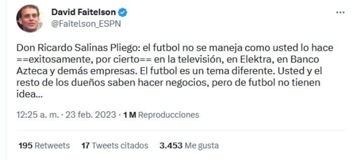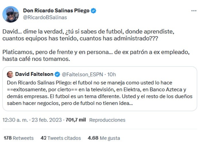 Luego de que el empresario Ricardo Salinas Pliego sugiriera eliminar el descenso en la Liga MX, el periodista deportivo David Faitelson dijo que el magnate quiere "apoderarse" del futbol mexicano, pues "piensa con la cartera".Por medio de Twitter, el fundador de Grupo Salinas consideró indispensable lograr la salud y estabilidad financiera de los equipos de la Liga MX."Es indispensable lograr la salud y estabilidad financiera de los equipos de la Liga MX para que los dueños podamos pensar y actuar con la visión de largo plazo, para invertir y poder formar nuevos jóvenes jugadores", se lee en el tuit.Sin embargo, el conductor de deportes cuestionó su dicho, pues "es indudable indicar que los propietarios de clubes del futbol mexicano piensan con la cartera"."Propone Ricardo Salinas Pliego, dueño de TV Azteca y quien controla 4 clubes, 'cerrar la Liga MX, desaparecer para siempre el descenso y eliminar las multas'. ¡Qué pena!"."Tengo la impresión de que Ricardo Salinas Pliego... quiere apoderarse del futbol mexicano", agregó.Ante ello, el dueño de Elektra respondió a Faitelson, quien, dijo, "que su logro más grande es vivir de hacer polémica". "Que no le de pena. Pena ser un cabr.. que se queja de todo, que su logro más grande es vivir de hacer polémica. Para que vea que me sobran "ganas" a ver qué día nos sentamos a platicar, ahh pero no se vale decir pendej... bueno, poquitas, para que usted pueda hablar de algo".Por su parte, el periodista deportivo señaló: "Don Ricardo Salinas Pliego: el futbol no se maneja como usted lo hace ==exitosamente, por cierto== en la televisión, en Elektra, en Banco Azteca y demás empresas. El futbol es un tema diferente. Usted y el resto de los dueños saben hacer negocios, pero de futbol no tienen idea…".Finalmente, el dueño de TV Azteca invitó al cronista a tomarse un café. "David… dime la verdad, ¿tú si sabes de futbol, dónde aprendiste?, ¿Cuántos equipos has tenido?, ¿Cuántos has administrado? Platicamos, pero de frente y en persona… de ex patrón a ex empleado, hasta café nos tomamos", sentenció.vll