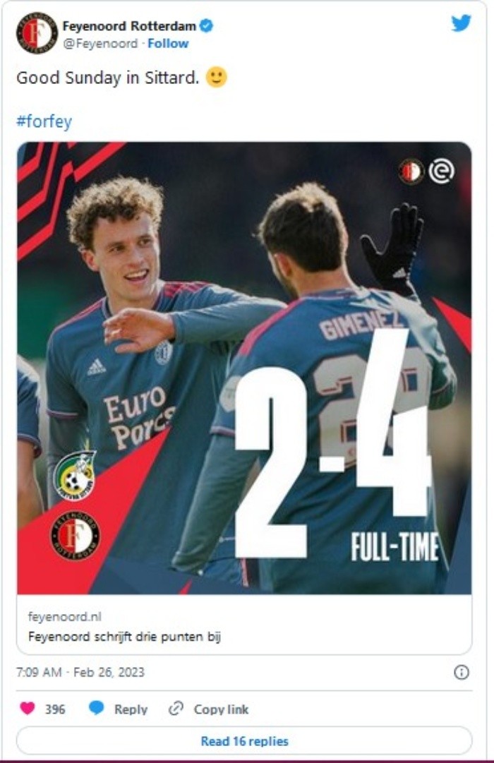 El Feyenoord visitó al Fortuna Sittard y salió goleando 4-2 del estadio, incluso el mexicano Santiago Giménez fue autor de una anotación.Santiago Giménez arrancó de titular en el estadio Wagner & Partners Stadion y demostró una vez más el nivel goleador que tiene antes de acabar el primer tiempo.Ximo Navarro (10’) y Mats Wieffer (16’) fueron los primeros en anotar a favor del Feyenoord, mientras que Santiago Giménez apareció (43’) para ampliar la ventaja.Luego de una salida errónea de Fortuna Sittard, específicamente de Ferati quien regresó el balón a propia portería, fue cuando Jahanbakhsh recuperó el balón y asistió a Giménez, que sin portero pudo definir con tranquilidad.Porteriomente Igor Paixao (63’) concretó la última anotación para el Feyenoord.Por parte del Fortuna Sittard lograron hacerse presente en el marcador Deroy Duarte (48’) y Dimitrios Siovas (84’), pero no fue suficiente.Con la victoria de este domingo el Feyenoord llega a 52 puntos y es líder de la Eredivisie, mientras que la anotación que logró Giménez es la sexta en su cuenta personal en el futbol de Países Bajos.JM