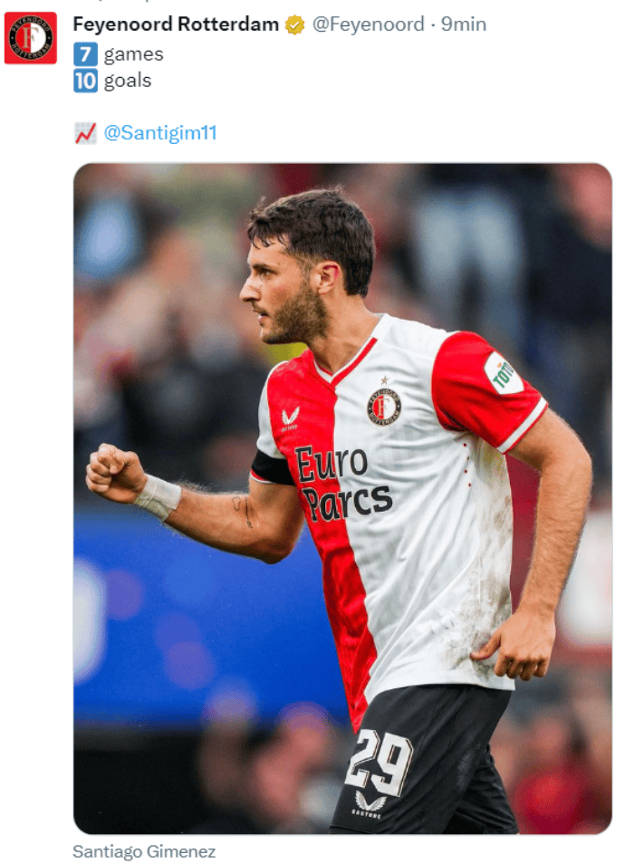 Una jornada más de éxito para Santiago Giménez, ya que el mexicano anotó de nueva cuenta en el triunfo del Feyenoord sobre el G.A. Eagles por un marcador de 3-1 y corta la ventaja con el PSV por el liderato de la liga.El conjunto de Rotterdam continúa con su paso perfecto en la Eredivisie imponiéndose ante sus rivales y con un Giménez que está motivado y no para de hacer goles.Al comienzo del encuentro, Santiago y compañía crearon jugadas al frente que daban los primeros avisos. Sin embargo, no fue hasta al minuto 39’ que Yankuba Minteh anotó el primero de la noche, pero después de ser revisado por el VAR, tuvo que ser anulado por una supuesta mano.Más adelante, Minteh nuevamente generó la posibilidad en sus pies de abrir el marcador y, esta vez, ni el árbitro lo impidió y antes de irse al descanso, el africano no desaprovechó la y permitió al Feyenoord irse arriba con el 1-0.Para la parte complementaria, con una superioridad notoria por parte del equipo del “Bebote”, vino el segundo tanto al 56’ por parte de Calvin Stengs y 20 minutos después, Giménez aumentó su cuota goleadora para sellar la victoria definitiva. Ya para la recta final del partido, los Eagles tuvieron una reacción tardía y al 85’ vino el descuento y el gol de la honra a través de Sylla Sow. Aunque para los últimos minutos se volcaron al frente, el tiempo ya no les alcanzó para intentar ir por el empate.De esta manera, Santiago Giménez llega a 10 goles en la campaña 2023/24 y se encuentra por encima de grandes delanteros como Haaland o Mbappé en este inicio de temporada de ligas europeas.En tanto que, Feyenoord acumula 17 unidades, posicionándose en el segundo puesto de la tabla general solamente por detrás del PSV, que lo supera por un punto.OA
