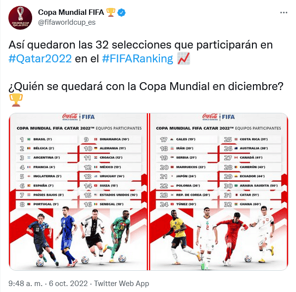 La Selección de Brasil, que dirige Tite, aumentó su ventaja sobre Bélgica al frente de la última clasificación mundial de la FIFA previa al Mundial de Qatar 2022, en la que España ha perdido la sexta plaza en favor de Italia. La Selección Mexicana también cayó en el ranking previo a la Copa del Mundo.El equipo que dirige Gerardo "Tata" Martino descendió un puesto tras ser superada por Croacia, que subió al lugar 12.Los puntos perdidos por el Tricolor reflejan el nivel tan bajo en el que se encuentran, pues en sus últimos cinco partidos, México suma dos victorias, dos derrotas y un empate.En la lista actual, México es 13, con un total de mil 644.89 puntos.En la última fecha FIFA, México le ganó de milagro a Perú y días después perdió contra Colombia pese a tener una ventaja de dos goles en el primer tiempo.Con esto, la Selección Mexicana ya no iniciará el Mundial de Qatar 2022 dentro del Top-10 de equipos nacionales, ya que se trata de la última lista revelada antes del inicio de la competencia.Un total de 53 partidos de la Liga de Naciones de la UEFA y 119 amistosos conformaron el programa de la última ventana internacional antes de la Copa Mundial de la FIFA Qatar 2022, que comenzará el próximo 20 de noviembre.Aquí puedes ver el ranking completo. Brasil intentará conquistar su sexto título mundial desde lo más alto de la tabla. La Canarinha, que salió airosa de sus amistosos con Ghana y Túnez, aumenta su ventaja sobre su más directa rival, Bélgica que perdió frente a los Países Bajos (octava). Argentina, que mantiene el tercer puesto, completa el podio. Al margen de los diez primeros, Croacia pasa del decimoquinto al duodécimo puesto e Irán sube hasta la vigésima plaza, seguida muy de cerca por Serbia (21), que da un salto de cuatro puestos. Sin embargo, las mayores subidas son las registradas por selecciones no clasificadas para la Copa Mundial, como Escocia (40) y Azerbaiyán (123), que ascienden cinco puestos. La próxima edición de la Clasificación Mundial FIFA se publicará el 22 de diciembre de 2022.OF
