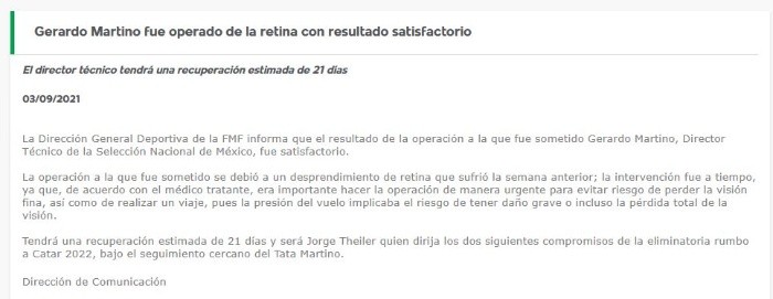 La Federación Mexicana de Futbol (FMF) informó este viernes que el director técnico de la Selección mexicana, Gerardo “Tata” Martino ha sido operado con éxito del ojo derecho, sin embargo deberá estar en reposo durante los próximos 21 días."De acuerdo con el médico tratante, era importante hacer la operación de manera urgente para evitar el riesgo de que (Martino) perdiera la visión fina", explicó la Federación Mexicana de Fútbol (FMF) en una nota de prensa.Esto significa que el timonel argentino no podrá estar presente ni observar los partidos de sus pupilos ante Costa Rica el domingo en San José, ni ante Panamá el próximo miércoles, por lo que su auxiliar Jorge Theiler se quedará como responsable del grupo que continuará con su participación en las Eliminatorias rumbo a Qatar 2022.Este sería el debut del “Tata” en partidos eliminatorios disputados en Centroamérica, ya que previamente lo hizo ante Jamaica el jueves en el Estadio Azteca a puerta cerrada.Si quieres tener más contenido, más imágenes y aún más noticias, entonces descarga INFORMAPlus, la aplicación digital de EL INFORMADOR, donde tenemos materiales exclusivos para tí.Descarga la aplicación y pruébala GRATIS por treinta días. Para iOS: https://apple.co/35jaVgbPara Android: https://bit.ly/3gwVSEVSi eres suscriptor de EL INFORMADOR tu acceso está incluido, solicítalo al 33 3678-7777JL