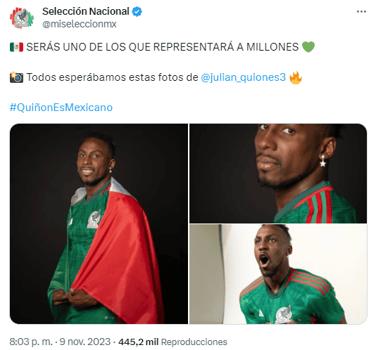 Después de varios meses de rumores, estos por fin fueron disipados. El delantero Julián Quiñones será convocado por el estratega Jaime Lozano para la siguiente Fecha FIFA, en la que la Selección Mexicana se enfrentará a Honduras en los cuartos de final de la Nations League de la Concacaf.Fue a través de un video que la Selección Mexicana confirmó el llamado del atacante del América para la siguiente convocatoria, en busca del boleto a la Copa América de 2024.En el video que fue publicado por las redes sociales de la Selección, el propio Quiñones dio "información personal", como edad, nacionalidad y comida favorita. Tras la publicación, el atacante de 26 años nacido en Colombia muestra un mensaje que dice "#QuiñonESMexicano".México jugará la ida de los cuartos de final de la Nations League, el próximo viernes 17 de noviembre, en Tegucigalpa, y la vuelta será el martes 21 en el Estadio Azteca.Julián Quiñones será convocado y al fin podrá realizar su debut como futbolista naturalizado, en una dura prueba para la Selección Mexicana que disputará su boleto a la Copa América.El ex de Tigres, Lobos BUAP y Atlas ya entrenó previo a la pasada Fecha FIFA con el equipo nacional; sin embargo, aún no contaba con pasaporte mexicano.*Mantente al día con las noticias, únete a nuestro canal de WhatsAppOF
