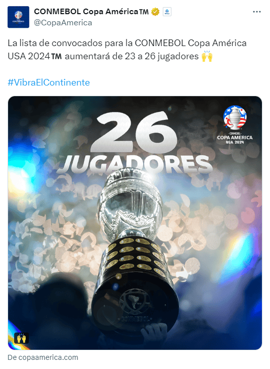 La Dirección de Competiciones y Operaciones de la Conmebol comunicó este jueves 16 de mayo ajustes en el Reglamento de la Copa América de Estados Unidos 2024, aprobados en una reunión realizada hoy mismo en Bangkok, Tailandia.En relación con el número de jugadores, la decisión es que cada selección podrá inscribir hasta un máximo de 26 jugadores en la competición (en la lista de buena fe), manteniendo un total de 50 personas en la delegación que son cubiertos por la organización del evento (acomodación, alimentación, transporte, de acuerdo con el régimen financiero y premiación previstos en el Capítulo 17 del Reglamento de la Competición).Esto quiere decir que la Selección Mexicana podría "fichar" a 3 refuerzos, es decir, llevar a tres jugadores más, siempre y cuando baje a otras tres personas integrantes del staff, o cubra los gastos de estos.Todos los jugadores (hasta 26 jugadores) deben estar en la Lista Provisional enviada hasta el día 5 de mayo de 2024.De esa manera, si una AMP decide inscribir más de 23 jugadores, deberá automáticamente inscribir menos oficiales para que totalice 50 miembros en la delegación (en el caso de que una AMP opte por la inscripción de 26 jugadores, el número de oficiales inscriptos en la lista de buena fe deberá ser de 24 integrantes, por ejemplo).El número máximo de integrantes de la delegación en la banca de suplentes en días de partidos seguirá siendo de 23 miembros entre jugadores y cuerpo técnico de la delegación. En el caso de que una AMP opte por alinear 26 jugadores – 11 en campo de juego y 15 en la banca, el número máximo de oficiales alineados deberá ser de 8, por ejemplo.Es importante mencionar que el número máximo de jugadores suplentes en la banca para cada partido es de 15 jugadores y el número mínimo de suplentes en la banca para cada partido es de 7 jugadores.*Mantente al día con las noticias, únete a nuestro canal de WhatsAppOF