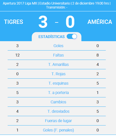 Tigres se convirtió en el primer finalista del Apertura 2017 al derrotar por 3-0 (4-0 global) a América, que terminó el partido jugando con nueve hombres y no anotó un solo gol en cuatro juegos de Liguilla.Los de la UANL se llevaron la victoria en la ida por marcador 1-0 el pasado miércoles 29 de noviembre con un penalti convertido por Juninho, capitán del equipo quien no participó en el partido de hoy a causa de una lesión.Los tantos del partido de vuelta fueron anotados por Enner Valencia (al minuto 55 y al 71') y André-pierre Gignac, de penalti (76').América ofreció un primer tiempo intenso, que no le bastó para abrir el marcador. Tigres apostó a contener los embates azulcremas para sentenciar el partido en un contragolpe.La estrategia casi rinde frutos a los felinos, que estuvieron cerca del gol hacia el final de la primera parte. Al minuto 41 Gignac disparó a puerta y Agustín Marchesín rechazó su disparo; en el contrarremate, Eduardo Vargas se perdió lo que parecía un gol inevitable.Al 42' Tigres volvió coquetear con el gol con un tiro de Valencia que se estrelló en la base del poste de la portería azulcrema.América respondió a los acercamientos de Tigres con una jugada peligrosa en el área de los felinos que Torres Nilo despejó al minuto 43.LEE-Minuto a minuto: Tigres vs AméricaAl minuto 50 América volvió a salvarse, cuando un disparo de Gignac cimbró el poste de la portería defendida por Agustín Marchesín.La suerte del América terminó con una anotación de Valencia, que puso el 1-0 (2-0 global) al minuto 55 con un toque raso ante la portería azulcrema.América concluyó el partido jugando con nueve hombres por las expulsiones de Rodríguez al 60' y Álvarez al 65'.Con las Águilas a su merced, Tigres no perdonó. Al 71' Valencia anotó su segundo gol y al 76' Gignac convirtió con un tiro de derecha un penalti cometido sobre Damm para concretar el pase a la final.Los Tigres disputarán el título la próxima semana contra el ganador de la otra serie de semifinales entre Monterrey y Morelia. Los regiomontanos se agenciaron el partido de ida por marcador 1-0 el pasado jueves; la vuelta se disputará mañana domingo a las 18:00 horas.ALINEACIONES:TIGRES (4-3-3): Guzman; Torres (Joshimar, 62'), Meza, Ayala, Rodríguez; Dueñas (Sosa, 68'), Aquino, De Souza; Valencia, Vargas (Damm, 45') y Gignac. D.T.: Ferretti.AMÉRICA (4-3-3): Marchesín; Aguilar, Álvarez, Samudio, Valdez,; Rodríguez, Ibarra, Uribe (Da Silva, 66'); Quintero (Lainez, 73'), Romero (Díaz, 55') y Peralta. D.T.: HerreraÁRBITRO: Fernando Guerrero Ramírez.