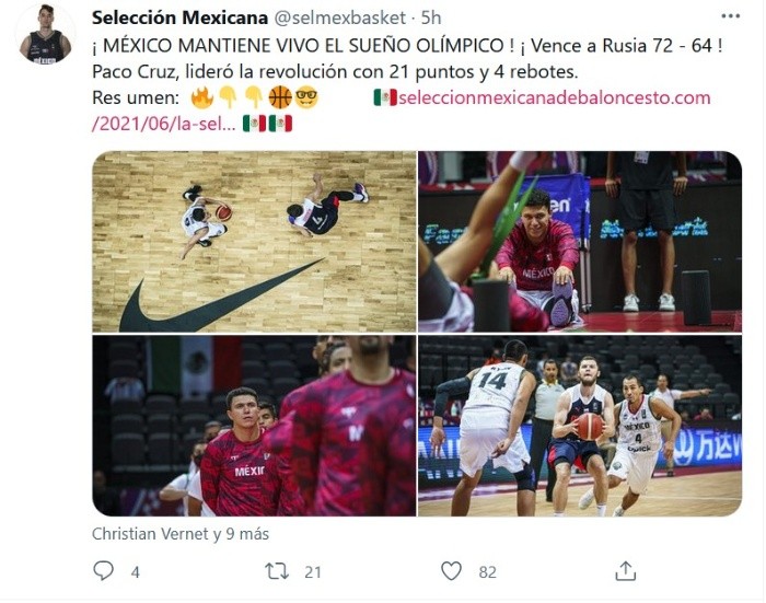 La Selección Mexicana de Basquetbol logró una importante victoria ante Rusia por 72-64 en el Spaladium Arena de Split, en Croacia, para mantener sus aspiraciones en el torneo de clasificación a los Juegos Olímpicos de Tokio 2020.El equipo mexicano se mantiene en espera del resultado entre Rusia y Alemania para determinar en qué lugar avanza, pero por el momento se encuentra como primero del grupo y con el pase a semifinales asegurado.Los dirigidos por Omar Quintero mostraron su autoridad ante los novenos del ranking mundial y dominaron tres de los cuatro periodos. El cuadro tricolor logró 92 por ciento de sus tiros libres, 40 rebotes, 10 robos y Paco Cruz fue el máximo anotador con 21 puntos.JM