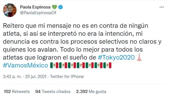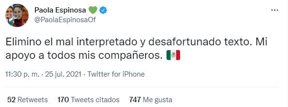 Después de que lanzara un polémico mensaje a través de Twitter, la clavadista mexicana, Paola Espinosa decidió borrar su publicación que, para muchos usuarios, era una crítica al trabajo de la dupla de clavados sincronizados de trampolín tres metros.La noche de este domingo, Espinosa mandó un nuevo tuit diciendo: "Elimino el mal interpretado y desafortunado texto. Mi apoyo a todos mis compañeros".Horas antes, la deportista envió otro mensaje diciendo que su reclamo no era "nada contra las atletas, el tema es contra el proceso selectivo y quienes lo avalaron así que sean felices".Paola fue muy criticada en las redes sociales después de publicar un texto, la madrugada del domingo, luego de la actuación de Dolores Hernández y Carolina Mendoza, que terminaron en cuarto lugar de la competencia.Descubre los contenidos exclusivos que tenemos preparados en INFORMAPlus, la aplicación digital de EL INFORMADOR, en donde a partir de las 12:00 del día, al término de cada jornada deportiva, se publicará un suplemento exclusivo con todos los detalles de lo que sucede en Tokio 2020.Más fotografías, más información y más datos sobre todos los atletas que buscan conquistar la gloria olímpica. Descarga la aplicación y pruébala GRATIS por treinta días. Para iOS: https://apple.co/35jaVgbPara Android: https://bit.ly/3gwVSEVJL