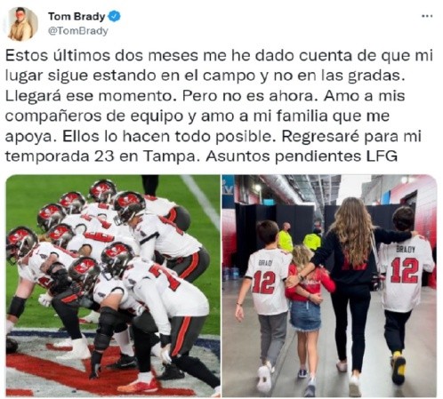 Tras anunciar su retiro no hace mucho, Tom Brady uno de los mejores jugadores jugadores en la historia del futbol americano confirmó que volverá a los emparrillados, para continuar con su carrera profesional con los Buccaneers de Tampa Bay.En aquella ocasión cuando el máximo ganador de Super Bowl dio a conocer la noticia de que no jugaría más, hizo que el mundo se paralizara, pues no se creía la decisión que había tomado el quarterback.Al parecer Brady se arrepintió de esto, ya que a través de sus redes sociales hizo oficial su regreso, para así poder disputar su temporada 23 en la NFL y seguir haciendo historia."Estos últimos dos meses me he dado cuenta de que mi lugar sigue estando en el campo y no en las gradas. Llegará ese momento. Pero no es ahora. Amo a mis compañeros de equipo y amo a mi familia que me apoya. Ellos lo hacen todo posible. Regresaré para mi temporada 23 en Tampa", escribió en sus redes sociales.En las últimas semanas, había muchos rumores sobre el entorno de Brady, algunos periodistas incluso aseguraban que iba a salir del retiro para jugar con los 49ers de San Francisco, equipo de su infancia. Al final sí salió del mismo, pero para regresar al equipo con el que hace un año se coronó campeón del Super Bowl.MF