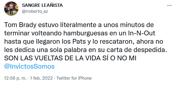 Este martes 1 de febrero Tom Brady confirmó su retiro de la NFL de manera oficial, pero hubo un detalle en la carta de despedida que publicó en sus redes sociales que llamó la atención de los aficionados y que los ha hecho especular.El 16 de abril del año 2000, el entrenador de los New England Patriots, Bill Belichick, dio el visto bueno para elegir al joven Tom Brady, quarterback que luego ganó seis títulos del Super Bowl con ese equipo, al que por alguna razón hoy no mencionó.En 20 temporadas con el mariscal de campo nacido en San Mateo, California, los Pats se convirtieron, junto con los Steelers, en la franquicia más ganadora de la NFL con seis trofeos Vince Lombardi. Además, fueron campeones de la Conferencia Americana en nueve ocasiones.A pesar de estos logros con el equipo precisamente junto al "coach" Belichick, el considerado mejor jugador de la historia del futbol americano no dedicó una sola palabra en su carta de despedida de nueve páginas, que publicó en sus redes sociales, al equipo que le abrió las puertas de la NFL.Pero, por otro lado, sí repartió reconocimientos para los Tampa Bay Buccaneers, con los que estuvo solo dos años, en los que obtuvo un Super Bowl."A mis compañeros Bucs de los últimos dos años; los quiero, me ha encantado salir al campo de batalla con ustedes. No podría estar más feliz por lo que hemos conseguido juntos", dijo Brady en su texto.Los aficionados de Tampa Bay también recibieron el cariño del ahora ex pasador de 44 años en su despedida, en la que no se acordó de mencionar a los fanáticos de los Pats que le aplaudieron por dos décadas."A los aficionados de los Bucs, gracias. No sabía qué esperar cuando llegué aquí, pero su apoyo y abrazo han enriquecido mi vida y la de mi familia. Es un honor haber jugado para una afición tan apasionada y divertida".No se olvidó del gerente general Jason Licht, quien lo contrató como agente libre cuando dejó a New England en 2020."A Jason Licht, gracias por tu apoyo a diario y tu amistad; nunca lo olvidaré. Tu liderazgo me dio confianza y eso lo agradeceré siempre".Brady también destacó la paciencia del entrenador de los Bucs, Bruce Arians, para sobrellevarlo."A mi entrenador, Bruce, gracias por aguantarme! Tu liderazgo y guía fueron ideales. No hubiéramos tenido éxito sin tu experiencia, intuición y sabiduría. Estoy muy agradecido".Tom Brady reconoció a su entrenador personal, el argentino Alex Guerrero, así como a su agente Don Yee y terminó su carta con una visión al futuro de las compañías que fundó."El futuro es emocionante. Tengo la fortuna de haber co-fundado compañías como Brady Brand o TB 12 Sports a las que estoy emocionado de poder seguir ayudando a crecer y tal como mi vida, será un trabajo en progreso".Hubo, pues, agradecimientos para todos, pero no para los Pats, el entrenador Belichick y los aficionados con los que forjó su leyenda del mejor de la NFL.También mediante sus redes sociales, los seguidores de los New England Patriots han expresado su confusión debido a que no fueron mencionados ellos, el equipo o su entrenador en la carta con la que Tom Brady confirmó su retiro luego de varios días de especulaciones."Tom Brady pasa cinco páginas de Instagram agradeciendo a los fanáticos, propietarios, entrenadores, personal de los Bucs... y en las nueve páginas ni una sola mención de los Patriots", dijo el usuario @Toucherandrich.Y además de las quejas y los reclamos, los fanáticos han publicado una serie de memes en los que reprochan que se le haya olvidado parte de su historia al ex jugador, poseedor de múltiples récords.Y para terminar, Tom Brady se tomó un segundo para agradecer con un escueto mensaje, en el que comparte la carta que los Pats le dedicaron en su cuenta de Twitter."Gracias Nación Patriot! Estoy profundamente agradecido. Los amo a todos ustedes", dice Tom Brady.OF